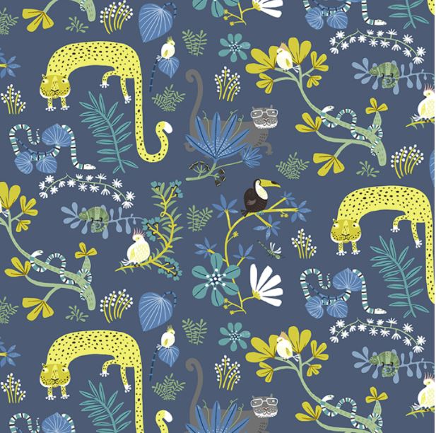 Come have a party in the wilderness, with the colourful Jungle Jive collection from Clothworks! Full of gorgeous citrus shades contrasted against dark blue, this bright and eye-catching print features some classic jungle creatures like leopards and cockatoos playing amid the undergrowth... Great for everything from quilts and patchwork, to dressmaking and home accessories.