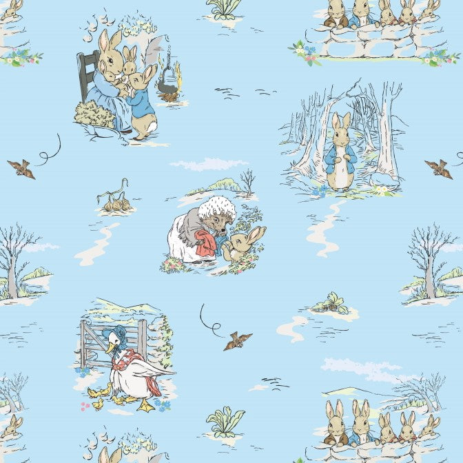 Get that nostalgic feeling going with this adorable set of prints inspired by Peter Rabbit from Beatrix Potter. Featuring the classic illustrations of Peter and all his friends, they're finished in sweet pastel shades. This sweet print finds Peter and his friends playing out in the fields, making mischief! Use it for everything from bunting to cushions and home accessories, quilts to clothing.
