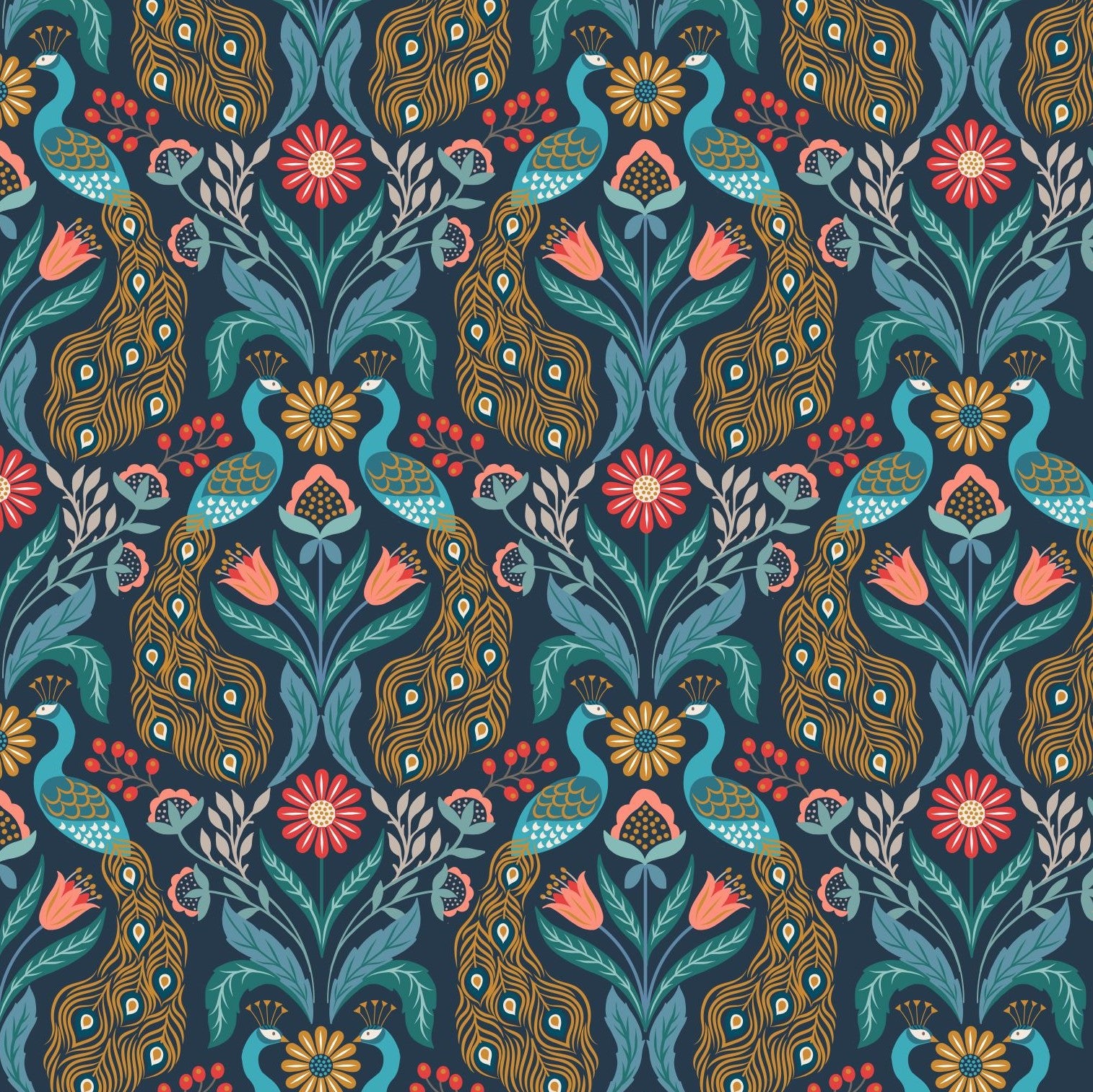 Lewis & Irene Wintertide - Peacock Dark Blue/Copper (metallic) - 100% Cotton Fabric