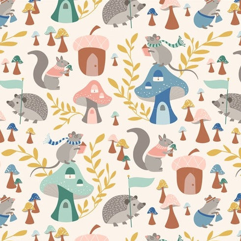 A fun and friendly collection for children from P&B Textiles, come and join the creatures of the woodland in their own little homes. This sweet animal print features mice, hedgehogs and more pootling about as they do their daily tasks, dressed in the cutest knitwear. Ideal for quilting, patchwork, dressmaking, bags, nursery accessories and more!
