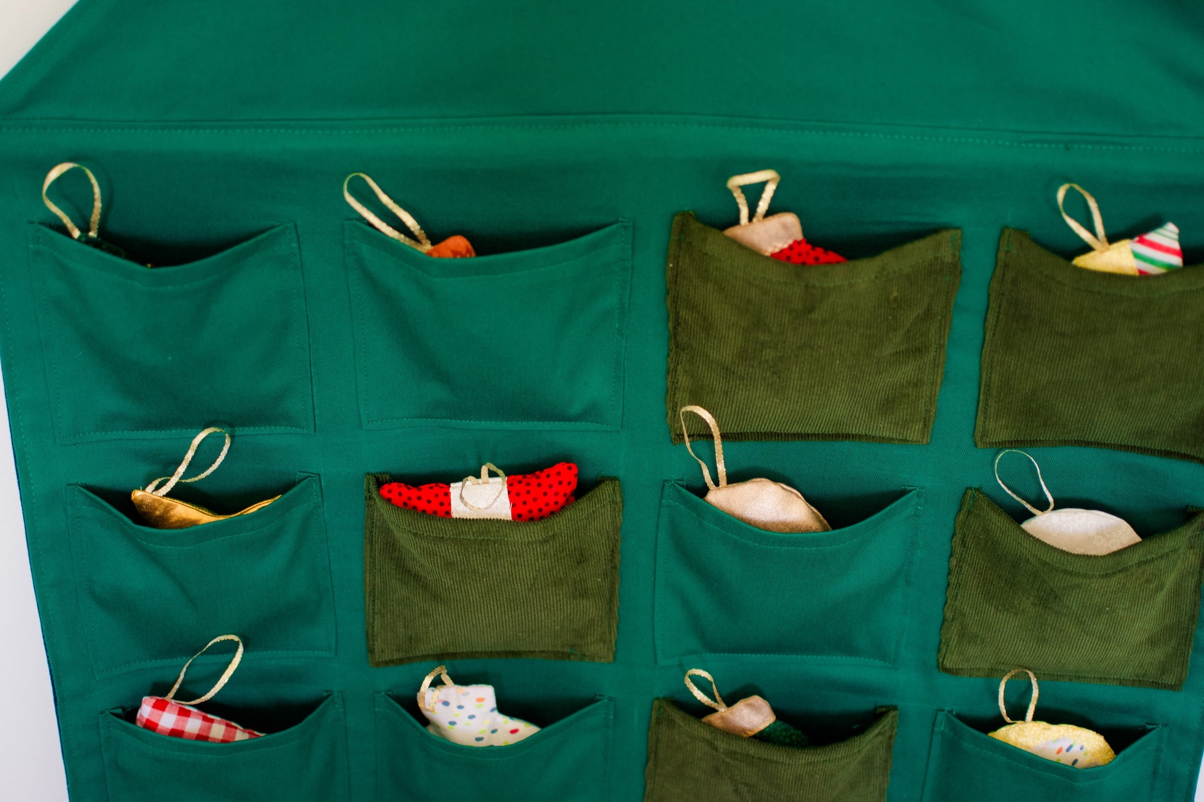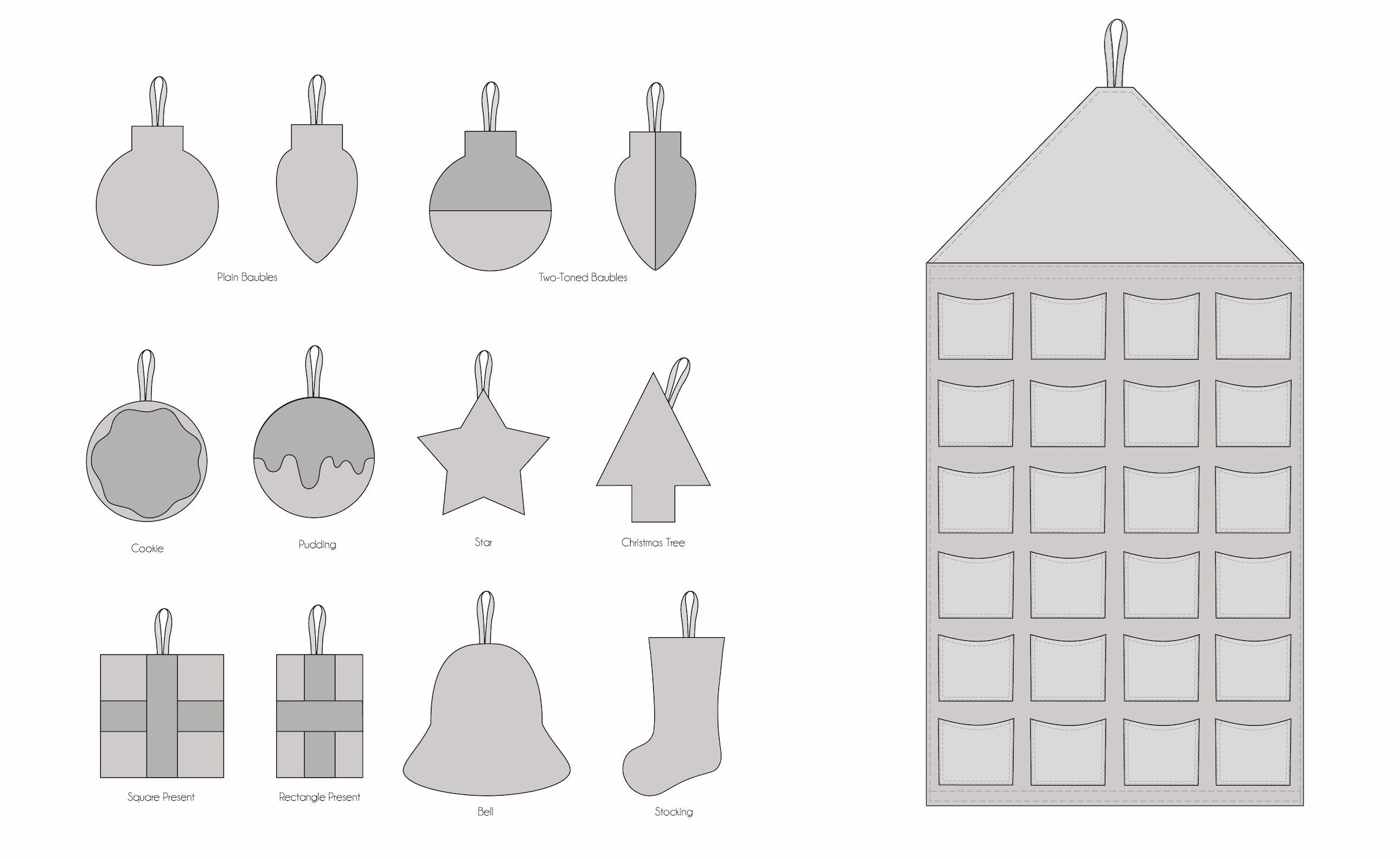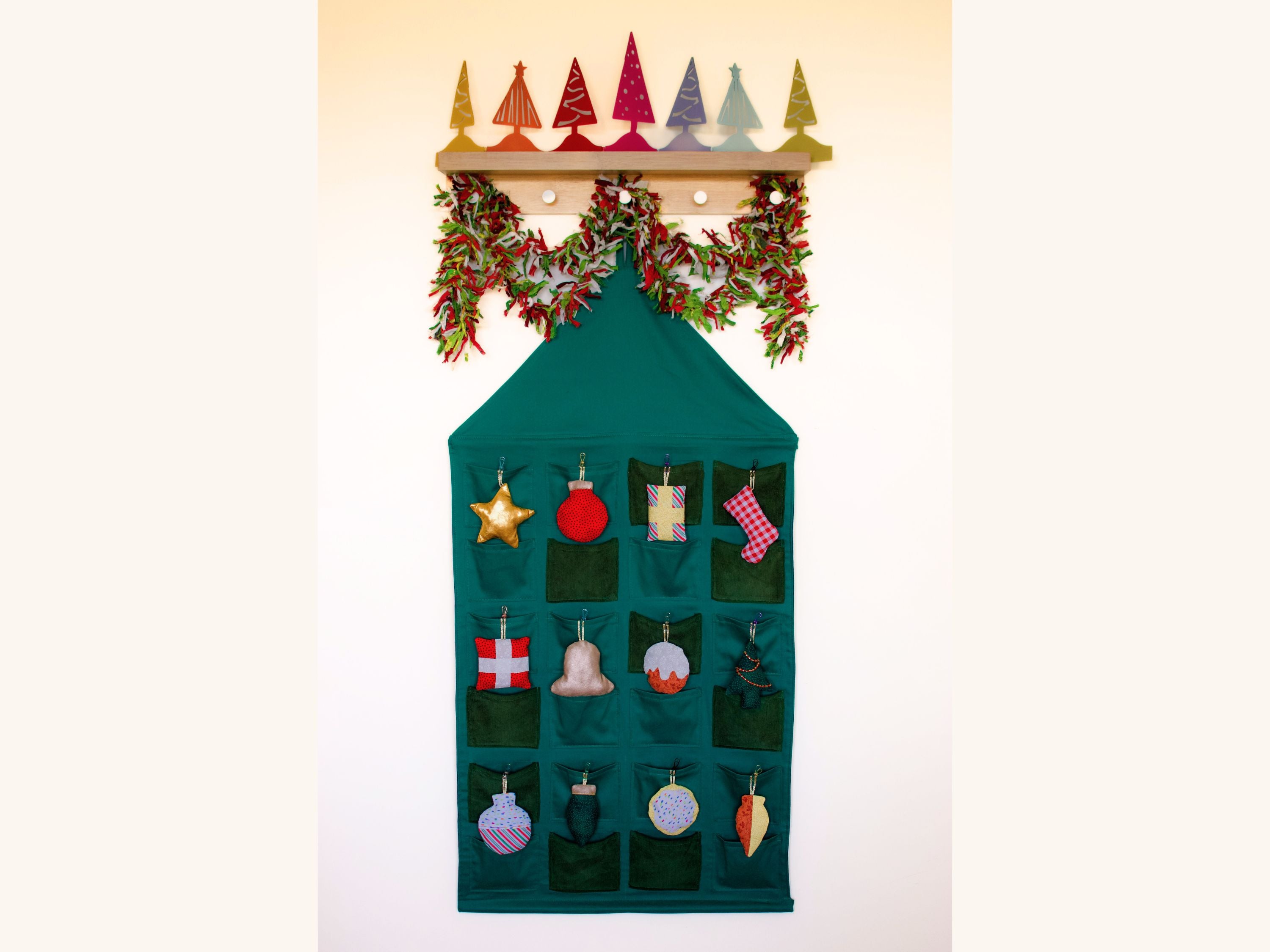 The Advent Calendar and Decorations pattern includes a pocket advent calendar and 12 different Christmas tree decorations. Fill the pockets of the advent calendar with the decorations for a fun, festive tradition, or fill the pockets with your own treats, or just make the decorations – the choice is yours!