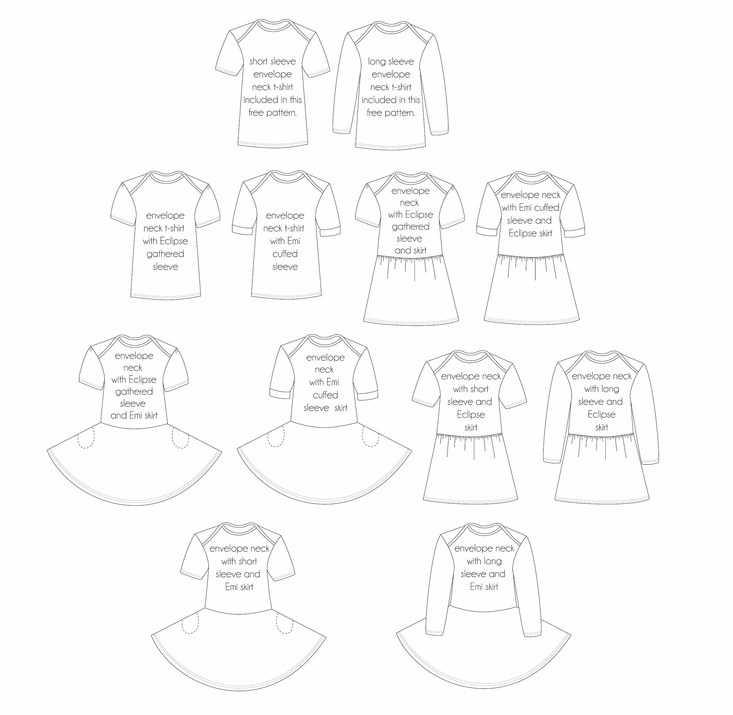 The Lunar t-shirt sewing pattern is a ‘sister pattern’ to the Emi and Eclipse. This means that sleeves and skirts from either can be mix-and-matched with the Lunar. As a result you can make a huge number of combinations from just a few patterns. For example, you can add the Emi skirt to create a twirly dress or try the Eclipse gathered sleeve for something a little different.