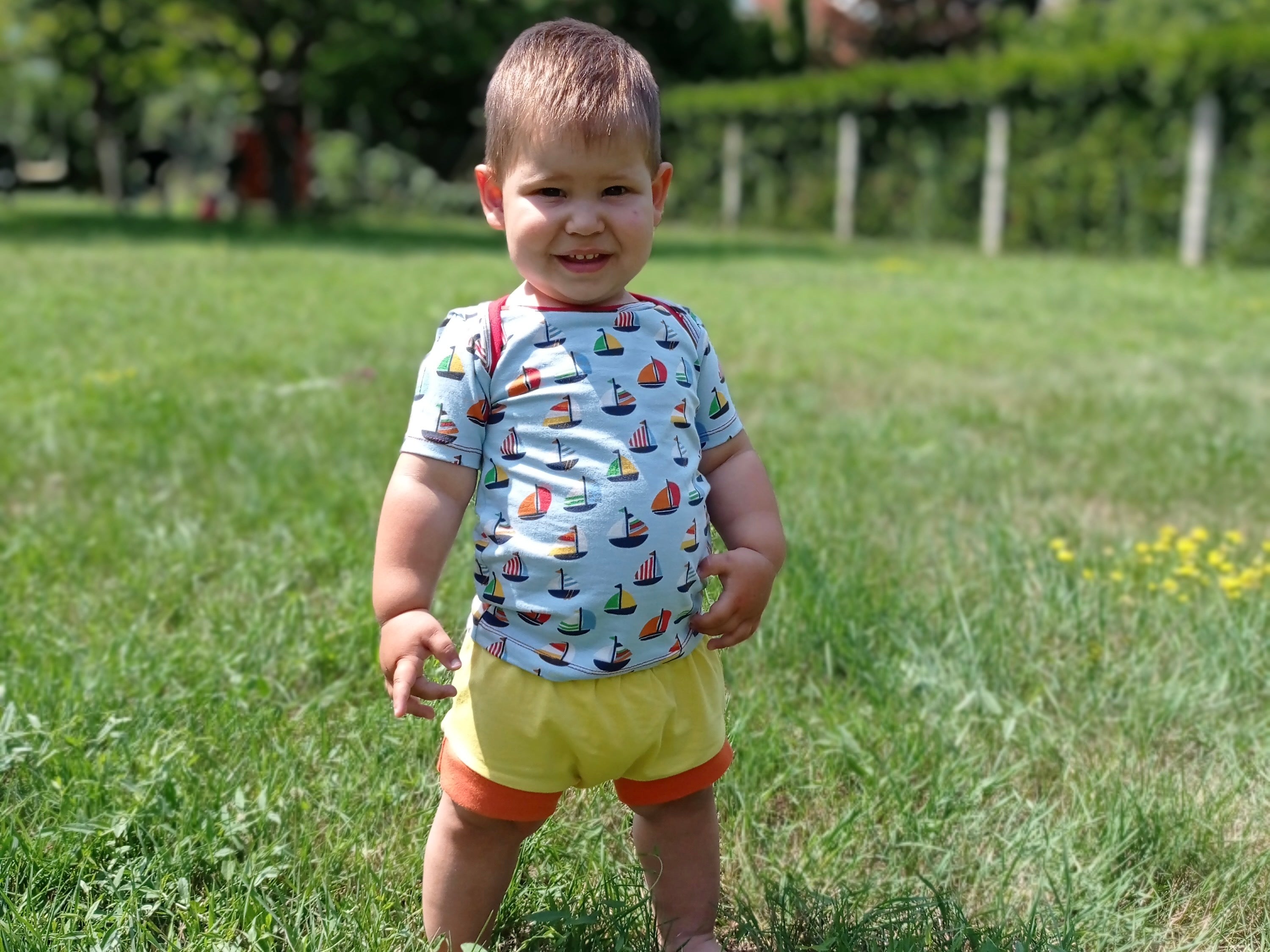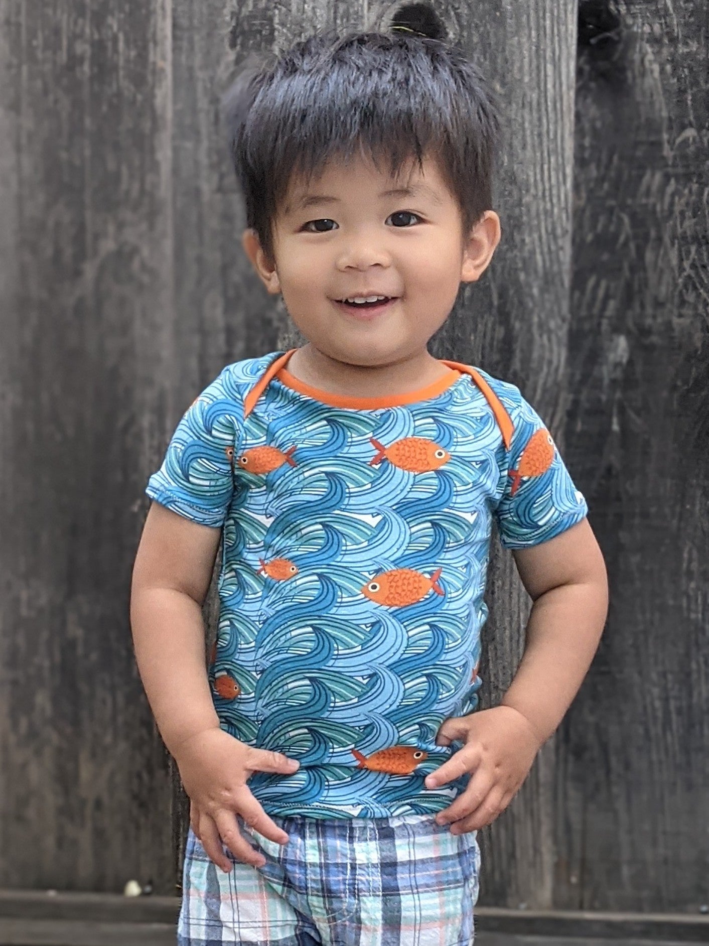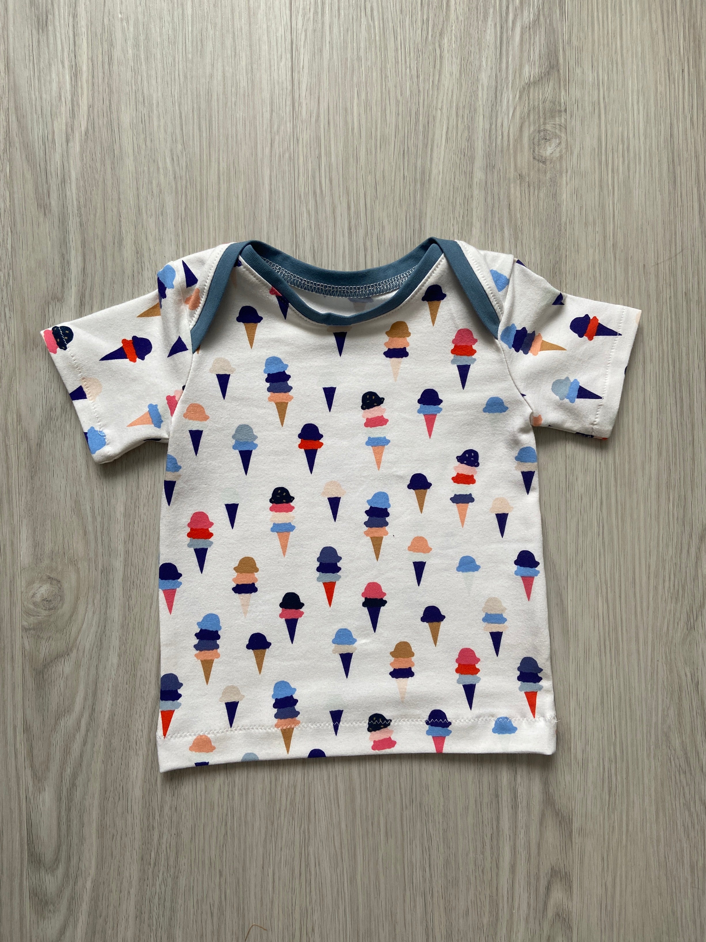 The Lunar is a slim-fitting envelope neck (lap-neck) t-shirt sewing pattern which goes from prem./small newborn up to Age 4.