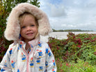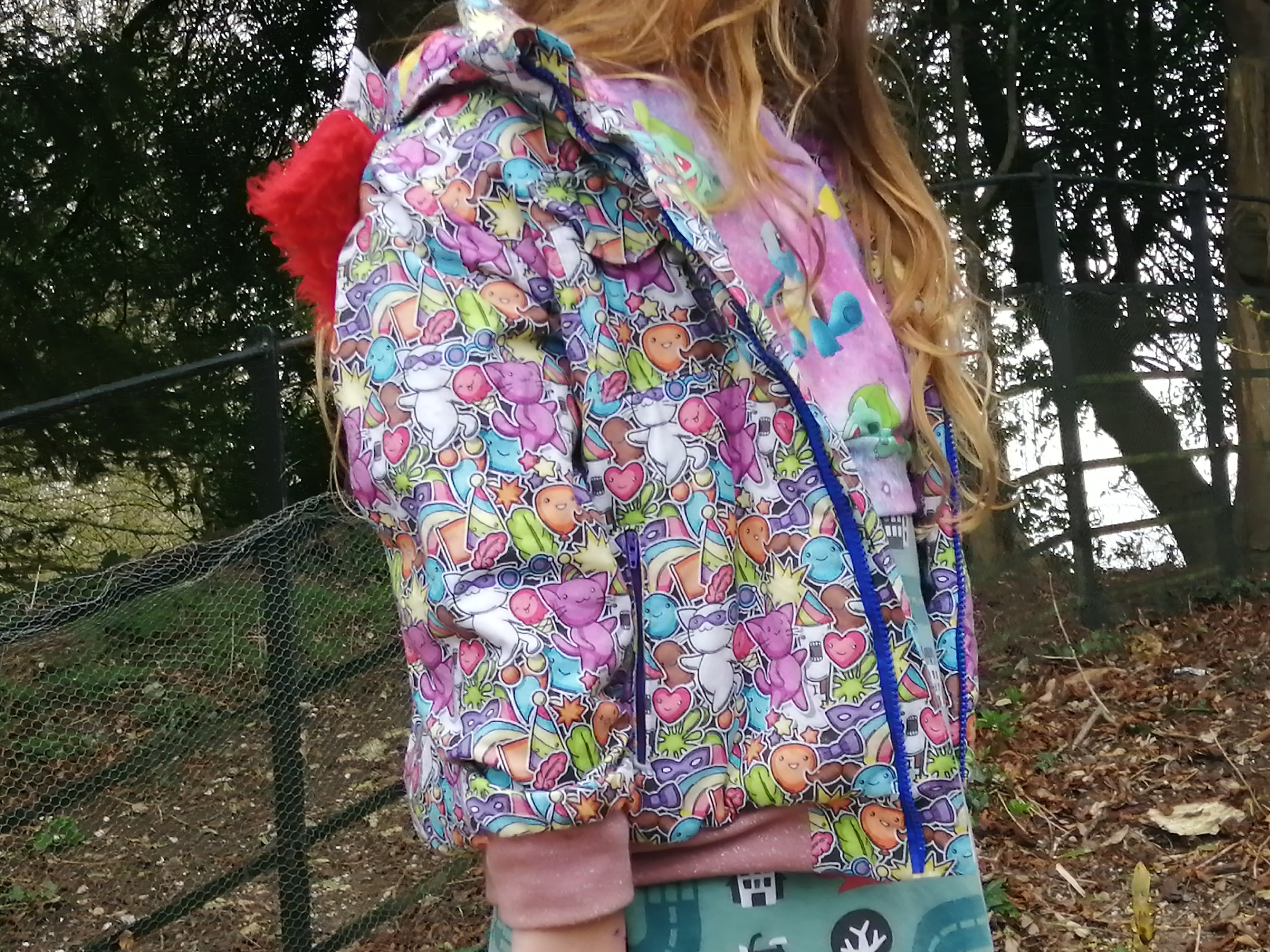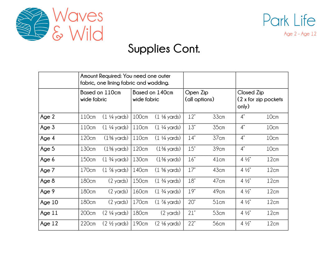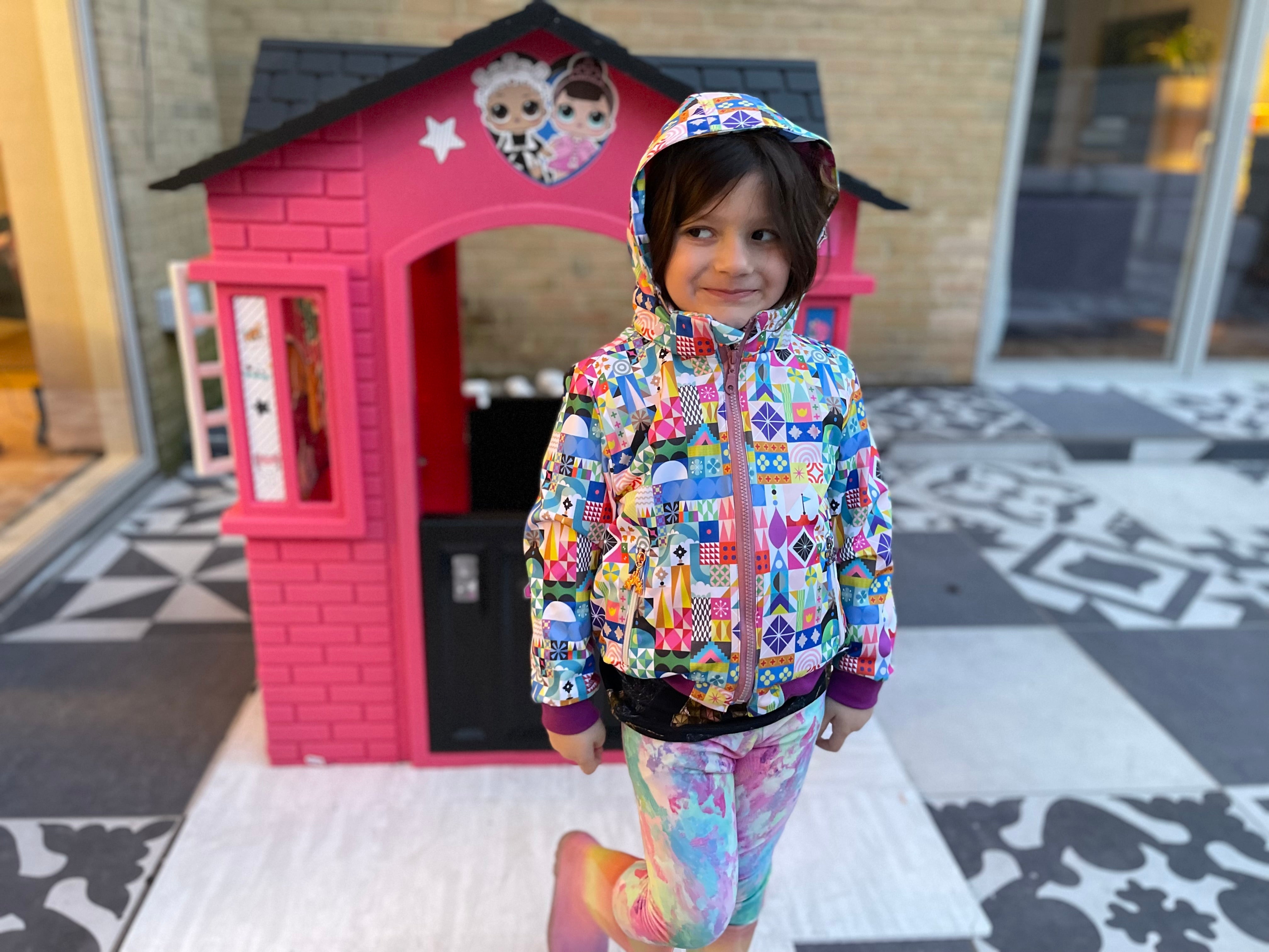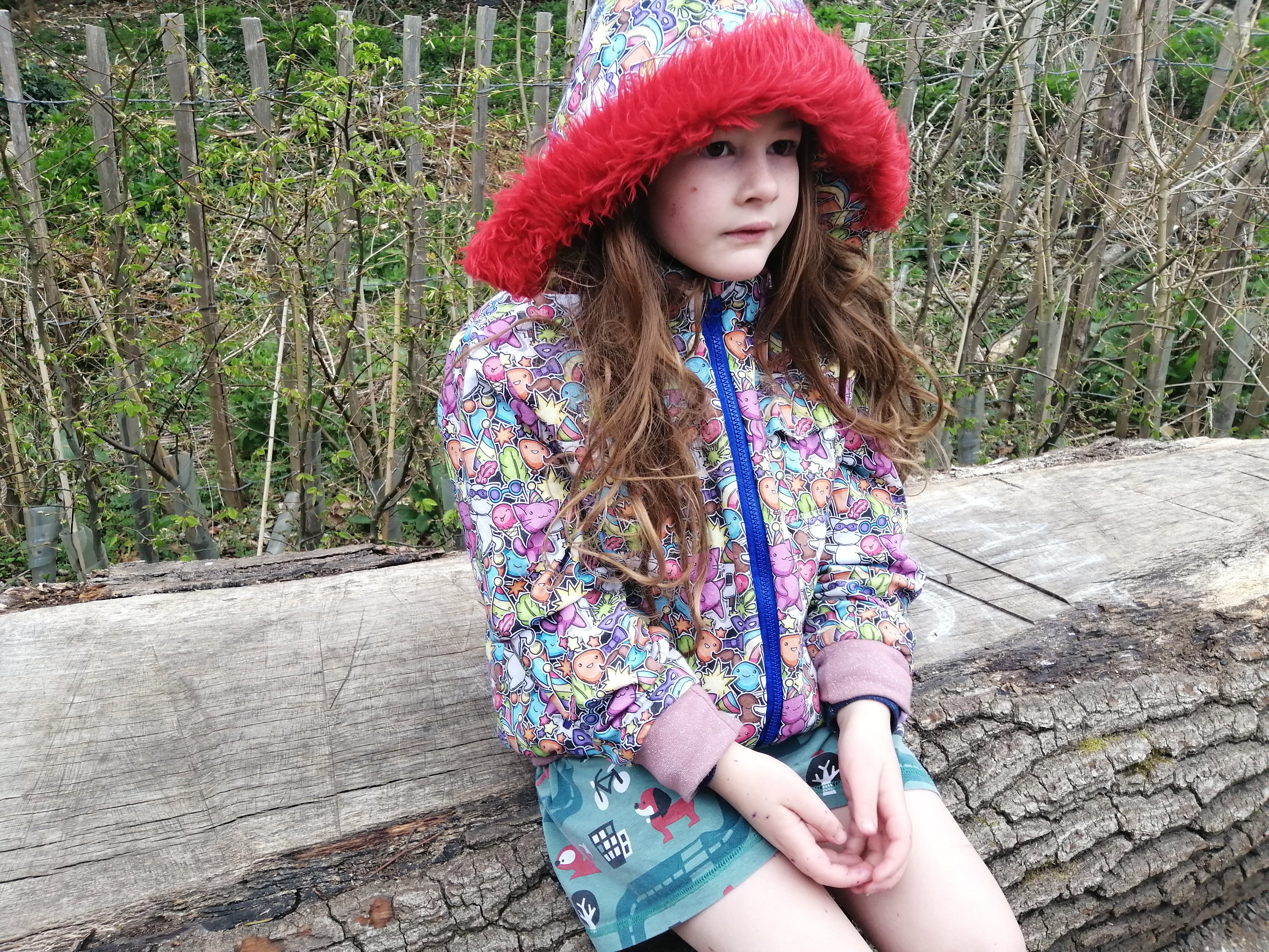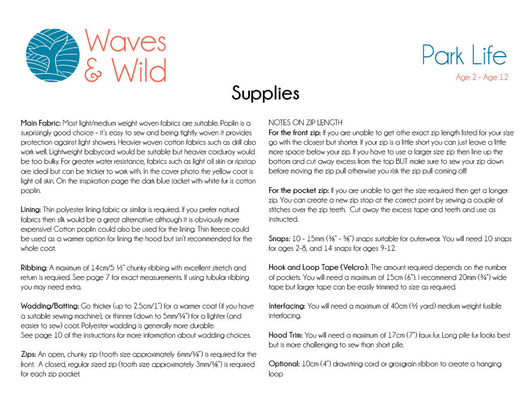 The Park Life goes from Age 2 up to Age 12. It has a removable hood which attaches with snaps. The hood has a removable fur trim. Wadding is added to create shape and add insulation. There are options for welt pockets, zip pockets and patch pockets.
