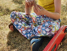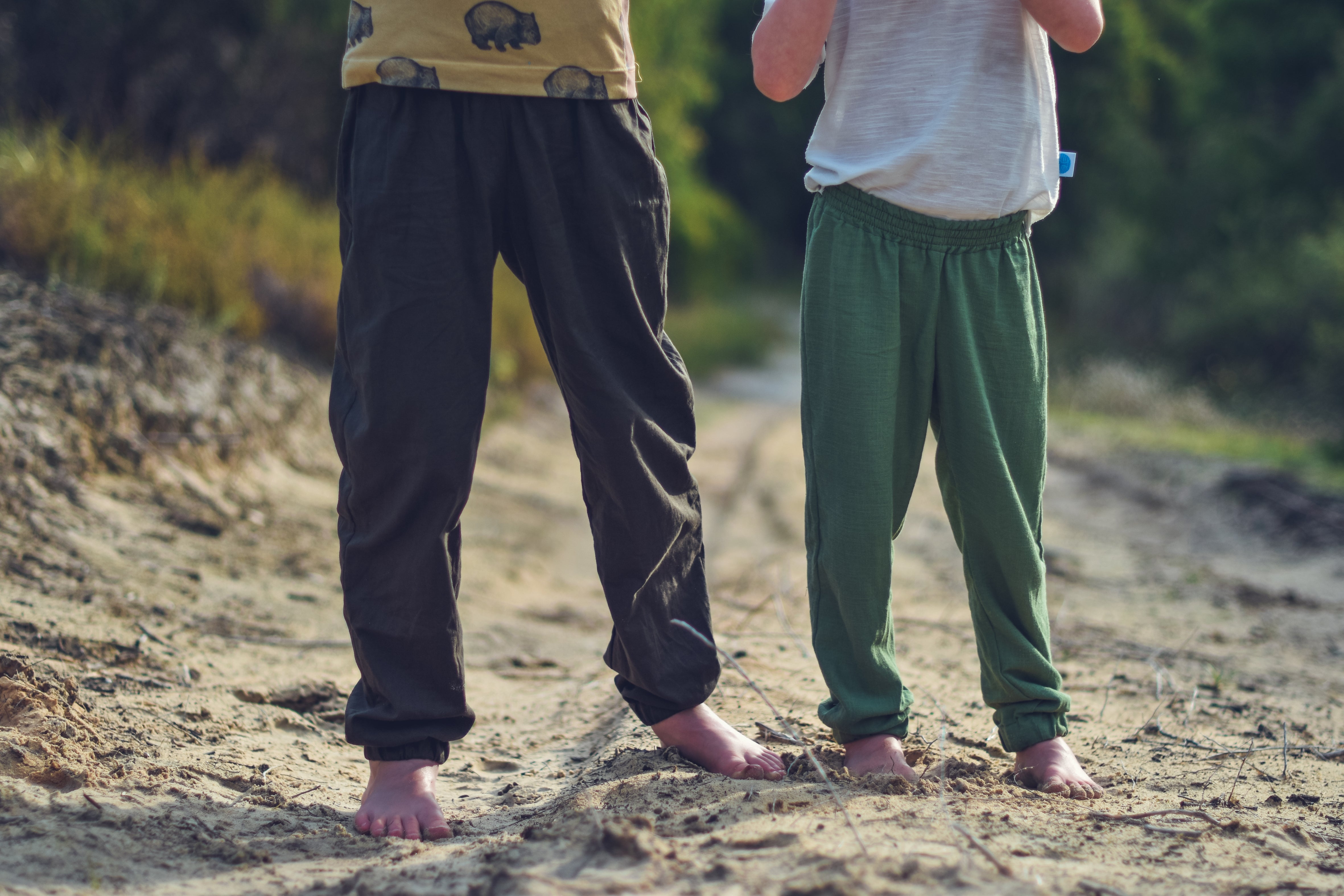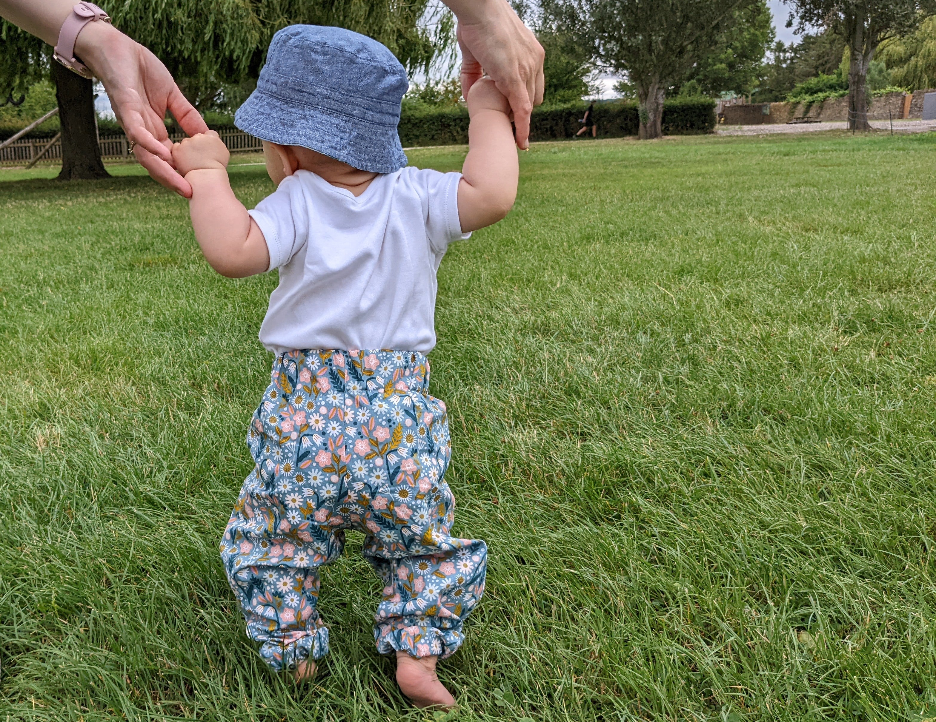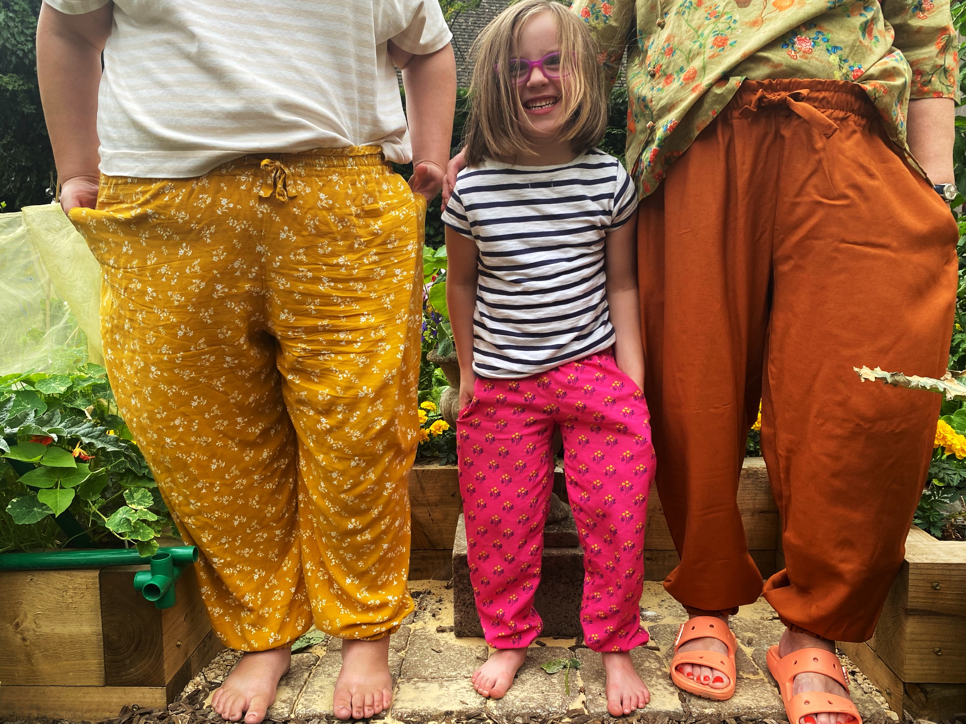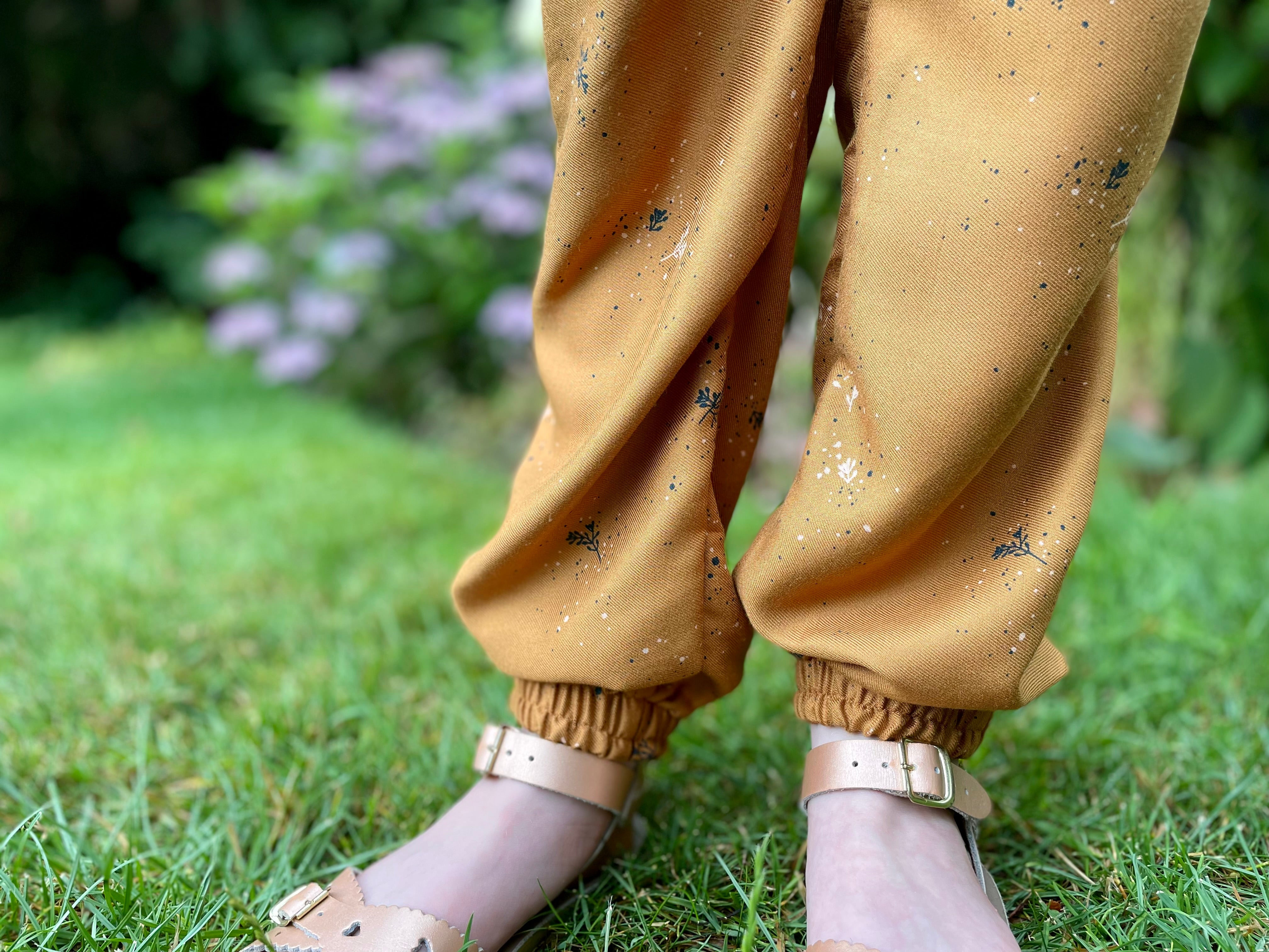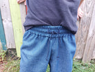 The Wayfinder is a relaxed, woven pants/trousers pattern. It has an elasticated waist and elasticated ankles. There is the option to add a real or faux drawstring and inseam pockets.