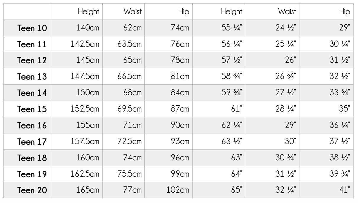 The Teen Measurement charts go from Teen 10 to Teen 20. The numbers are just names and do not indicate ages. Always use measurements when picking a size to make! A Teen 10 approximately matches a Child 10 and a Teen 20 approximately matches an Adult Medium so the Teen measurements bridge the gap between child and adult. This pattern uses the female/curve fit measurement chart.