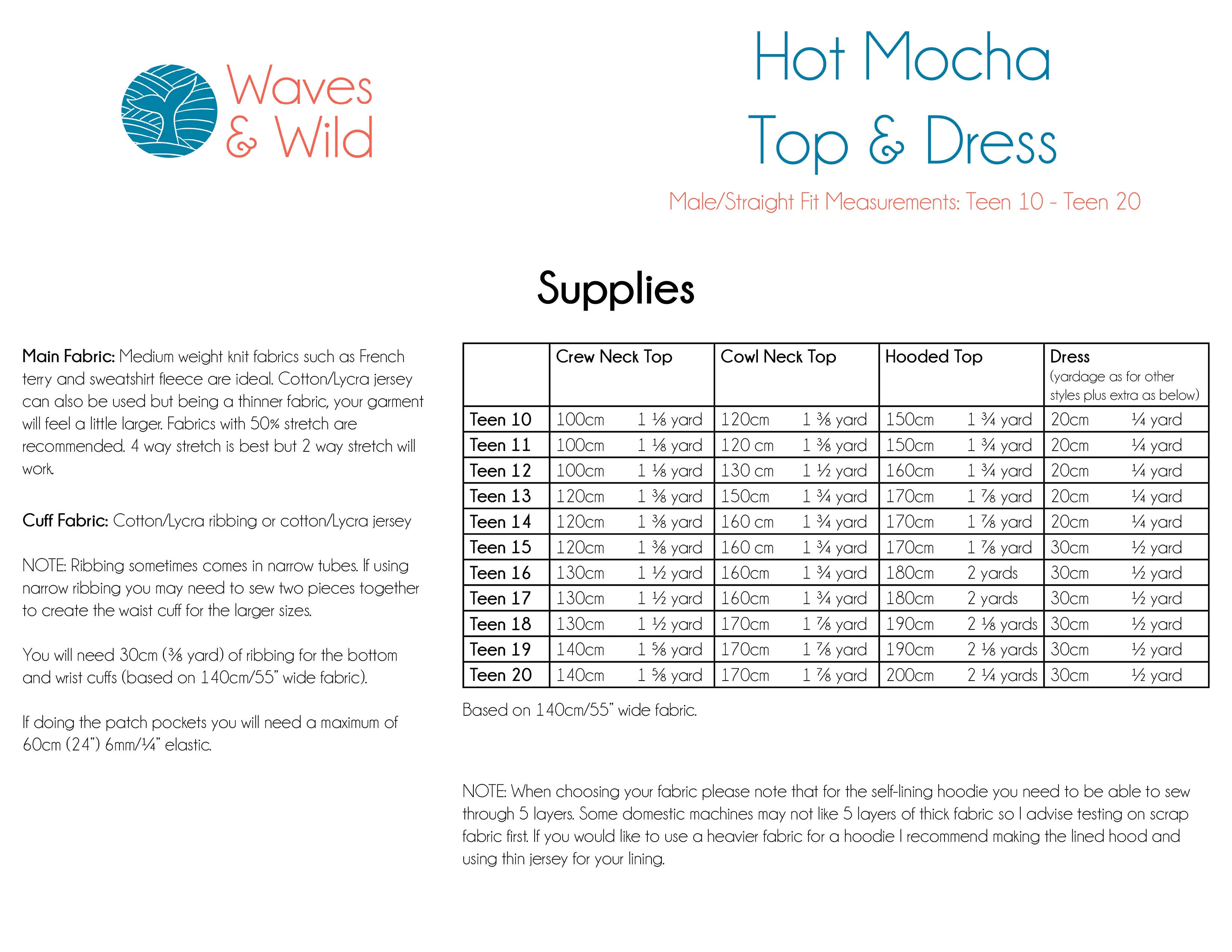The Teen Measurement charts go from Teen 10 to Teen 20. The numbers are just names and do not indicate ages. Always use measurements when picking a size to make! A Teen 10 approximately matches a Child 10 and a Teen 20 approximately matches an Adult Medium so the Teen measurements bridge the gap between child and adult. This pattern uses the female/curve fit measurement chart. There is another pattern that uses the female/curve fit measurement chart. Three is also matching child pattern that goes from prem./small newborn up to age 12 and two coordinating adult patterns called the Hot Coffee, one using the adult male/straight fit measurements and one that uses the adult female/curve fit measurements.