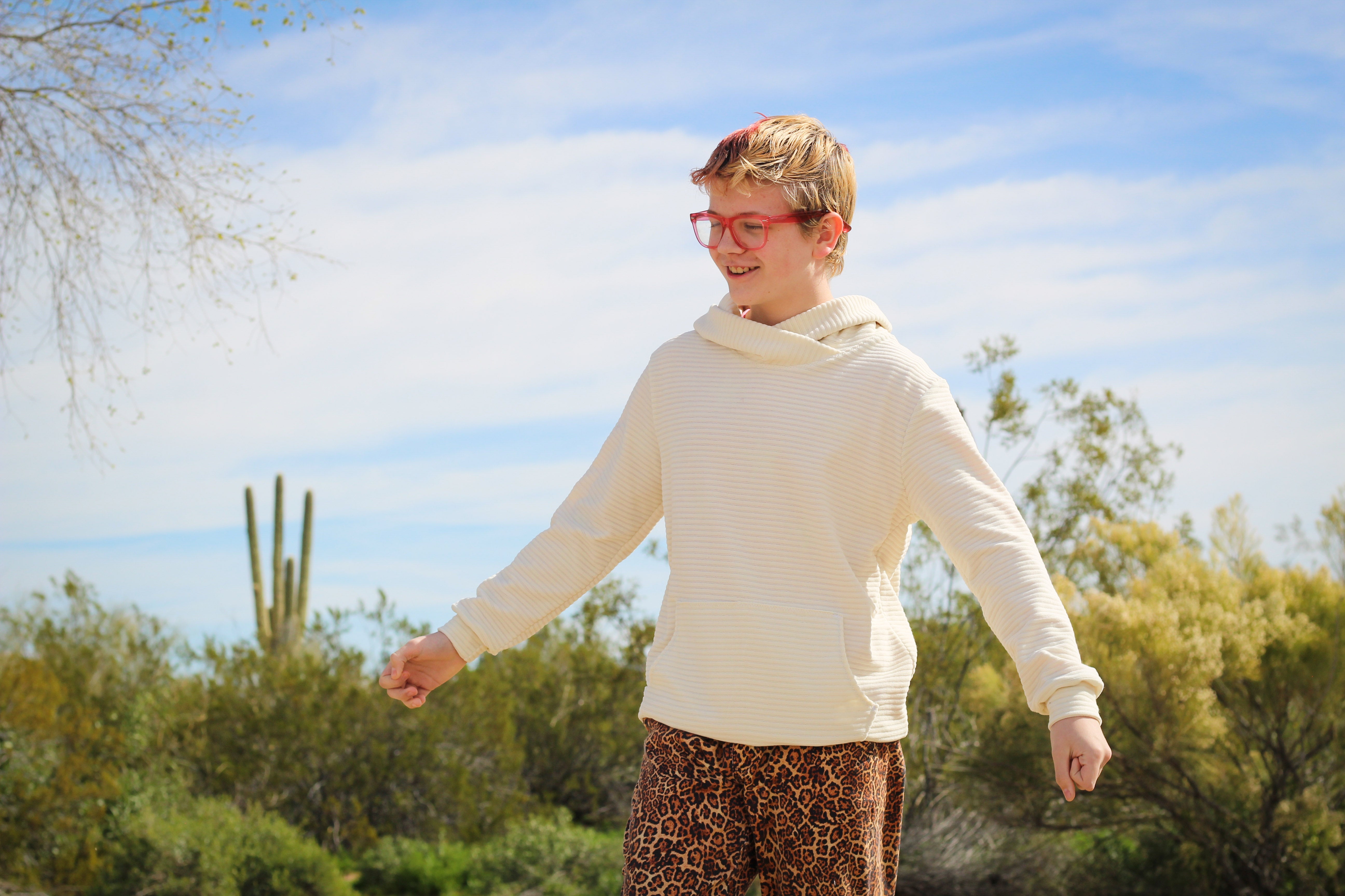 The Hot Mocha goes from Teen 10 to Teen 20. This pattern is suitable for enthusiastic beginners. Medium weight knit fabrics such as French terry or sweatshirt fleece are perfect for the Hot Mocha.