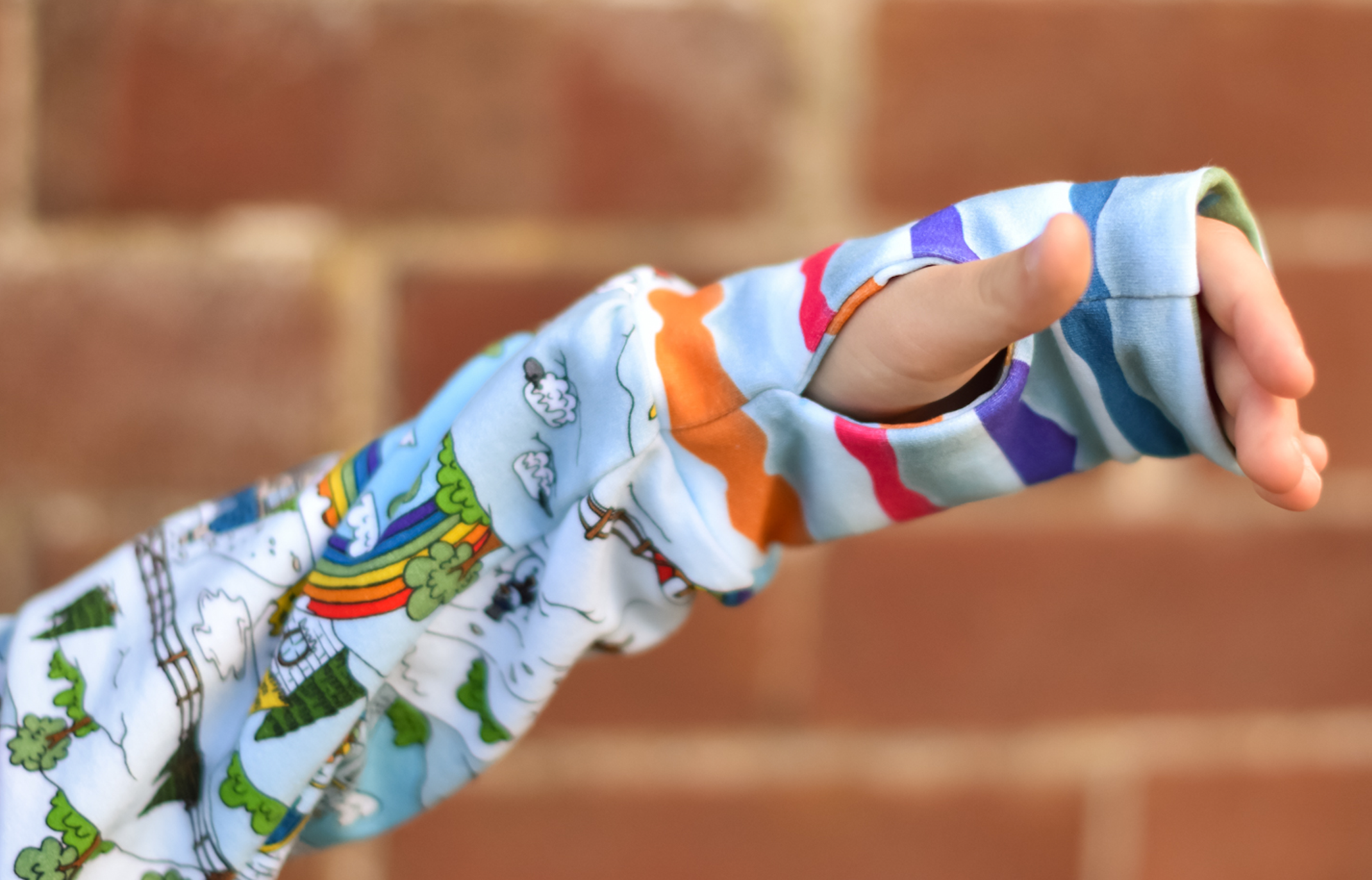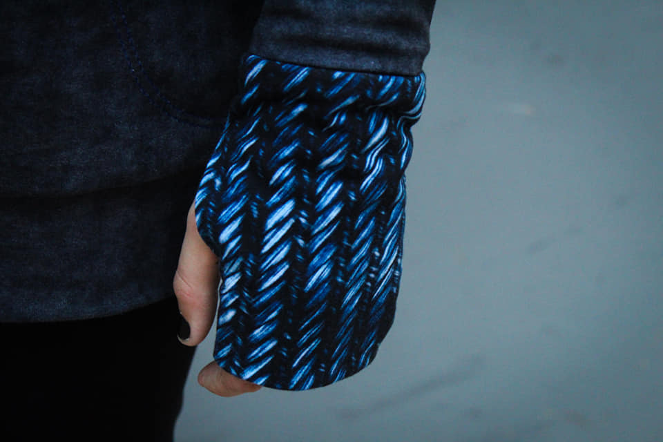 The Thumbs Up Cuff is a tutorial for thumb hole cuffs. There are pattern pieces which are designed to fit the Hot Chocolate and Hot Coffee patterns, but The Thumbs Up Cuff can easily be adapted to other patterns.