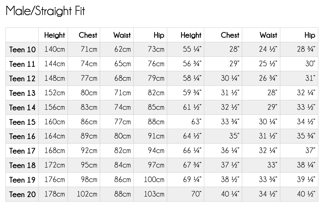 The Teen Measurement charts go from Teen 10 to Teen 20. The numbers are just names and do not indicate ages. Always use measurements when picking a size to make! A Teen 10 approximately matches a Child 10 and a Teen 20 approximately matches an Adult Medium so the Teen measurements bridge the gap between child and adult. This pattern uses the male/straight fit measurement chart. There is another pattern that uses the female/curve fit measurement chart. Three is also a full measurement chart in the product photos.