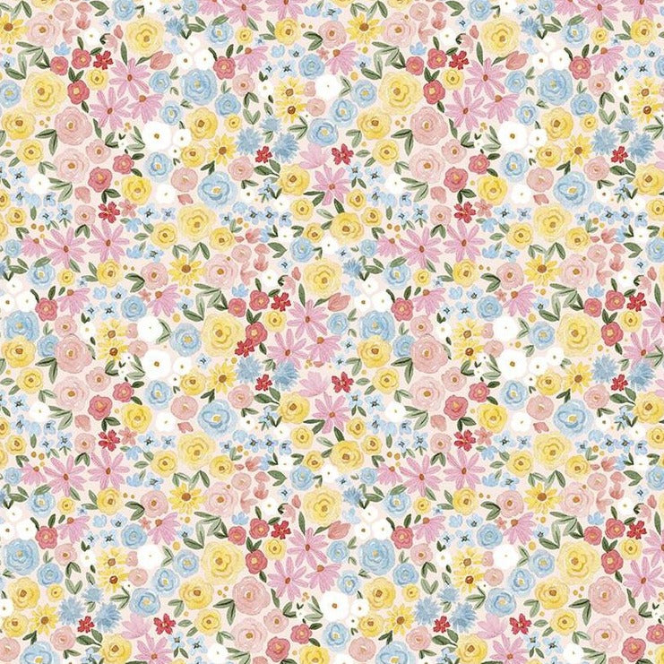 Celebrate the joy and vibrancy of the flowering garden with this beautifu collection of florals from Riley Blake. Warm shades of blush pink and yellow give this watercolour style design a sunny disposition! Great for a colourful quilting project, clothing or accessories.