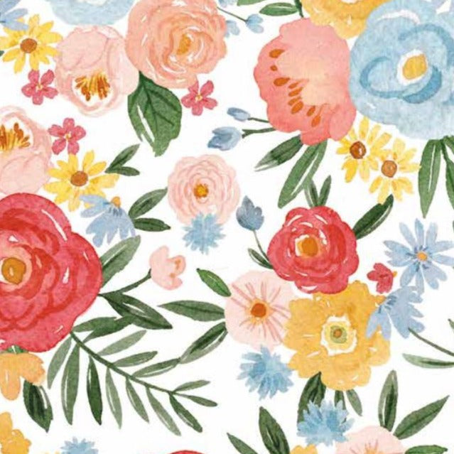 Celebrate the joy and vibrancy of the flowering garden with this beautifu collection of florals from Riley Blake. Warm shades of blush pink and yellow give this watercolour style design a sunny disposition! Great for a colourful quilting project, clothing or accessories.