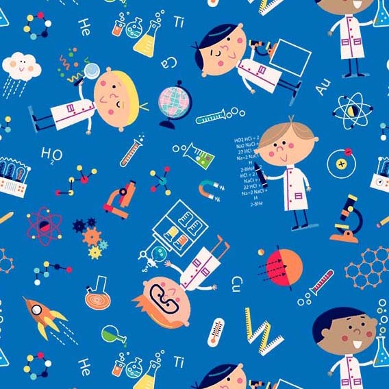 Share your passion for science with this fun and friendly set of prints from Michael Miller. This colourful design features some intrigued young scientists searching for their next discovery with test tubes and potions...ideal for the science lover in your life! Make into quilts, clothing, accessories and more.