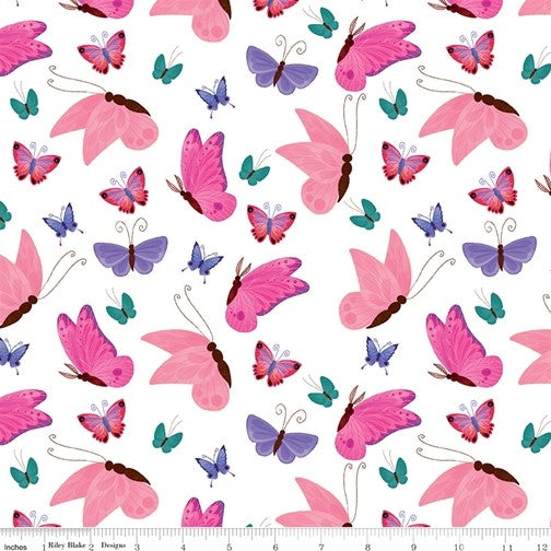 Get magical with this beautiful unicorn-inspired collection from Riley Blake! With a sweet colour palette of sugary pink, purple and crisp white, it's sure to be a big hit with little (and bigger) ones. We love this pretty butterfly design with varying size creatures, finished in different shades of pink for a sweet but simple style. Perfect for quilts, clothing, accessories and more!