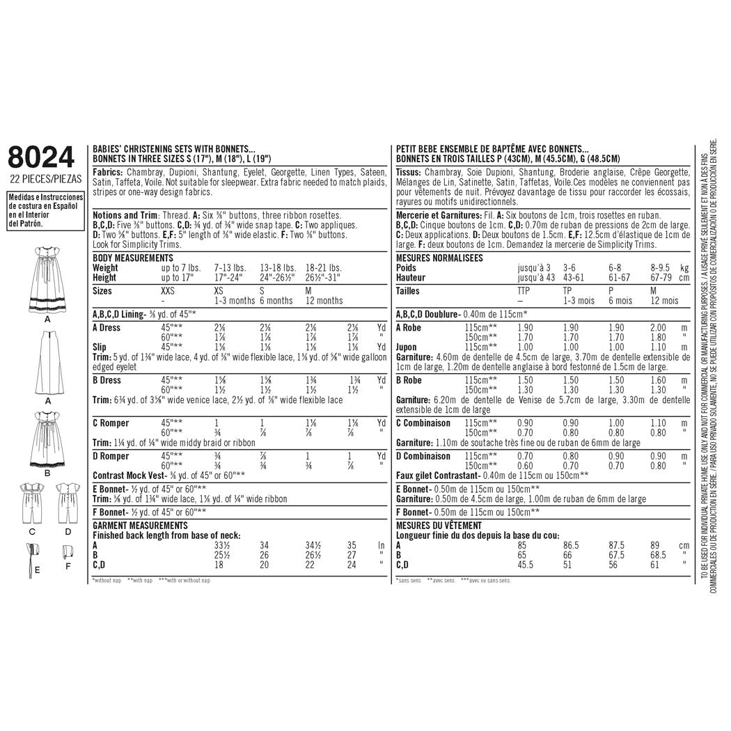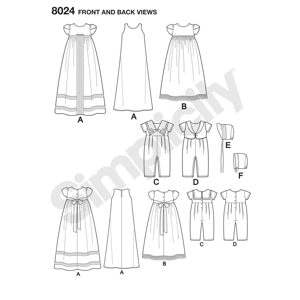 Simplicity Sewing Pattern 8024 - Babies' Christening Sets with Bonnets