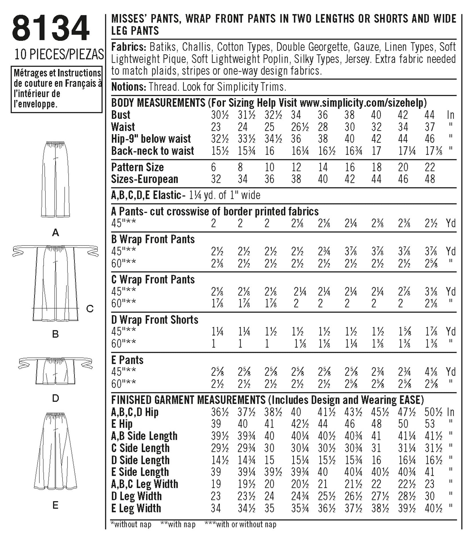 Women's Easy-to-Sew trousers features wrap front trousers, culottes, shorts that tie from side seam and elastic waist trousers that can be made with border printed fabric or with an extra wide leg.