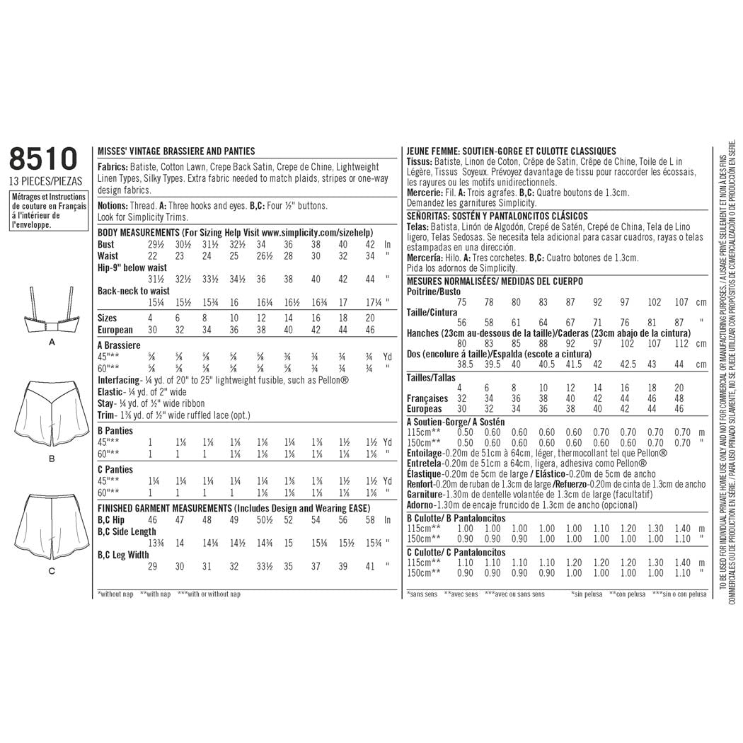 Simplicity Sewing Pattern 8510 - Miss Vintage Brassiere & Panties