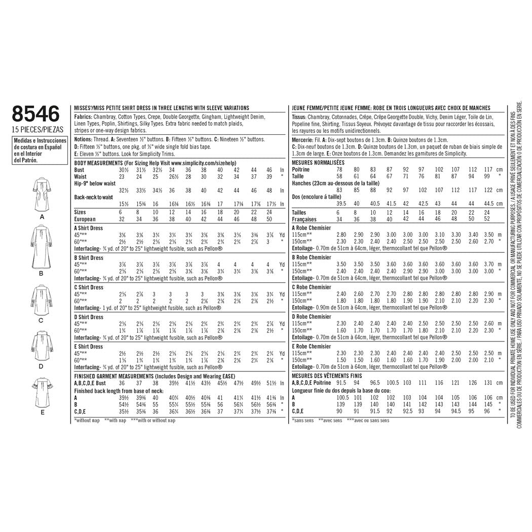 Simplicity Sewing Pattern 8546 - Women’s / Petite Women’s Shirt Dresses