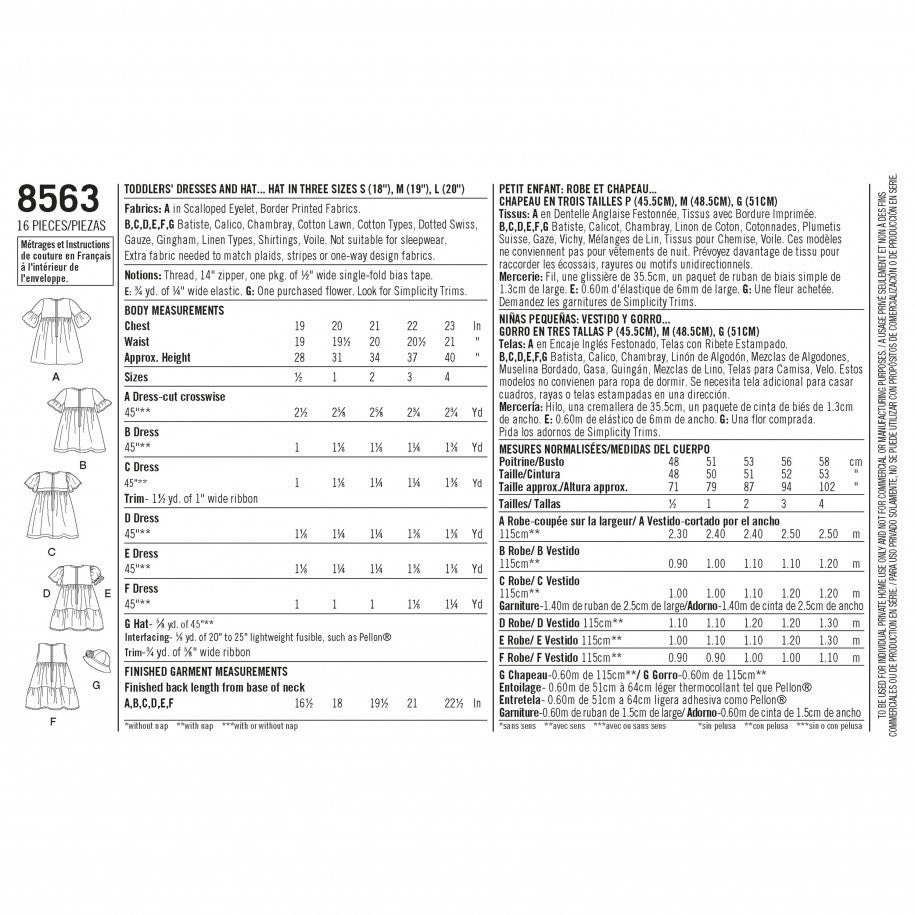Simplicity Sewing Pattern 8563 - Toddler Dresses and Hat