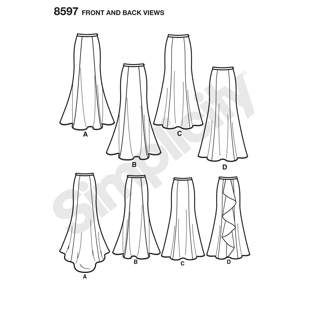 Mix and match your prom or special occasion look with these skirt sewing patterns sized for miss 8 - 16 and women 18W-26W. Silhouettes includes fishtail with and without train, mermaid with optional back flounce. All views include flattering princess seams. Great for floral, embellished and 3-D fabrics. See pattern 8598 for tops.