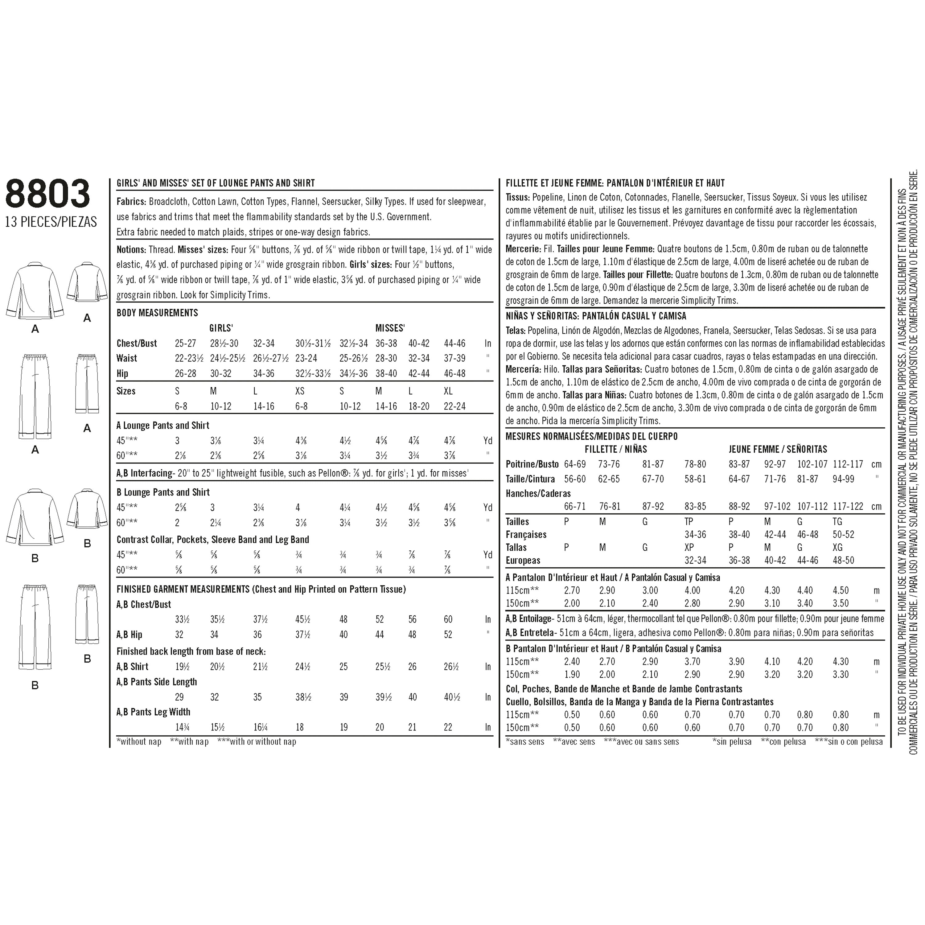 Simplicity Sewing Pattern 8803 - Girls and Misses Set of Lounge Pants and Shirt