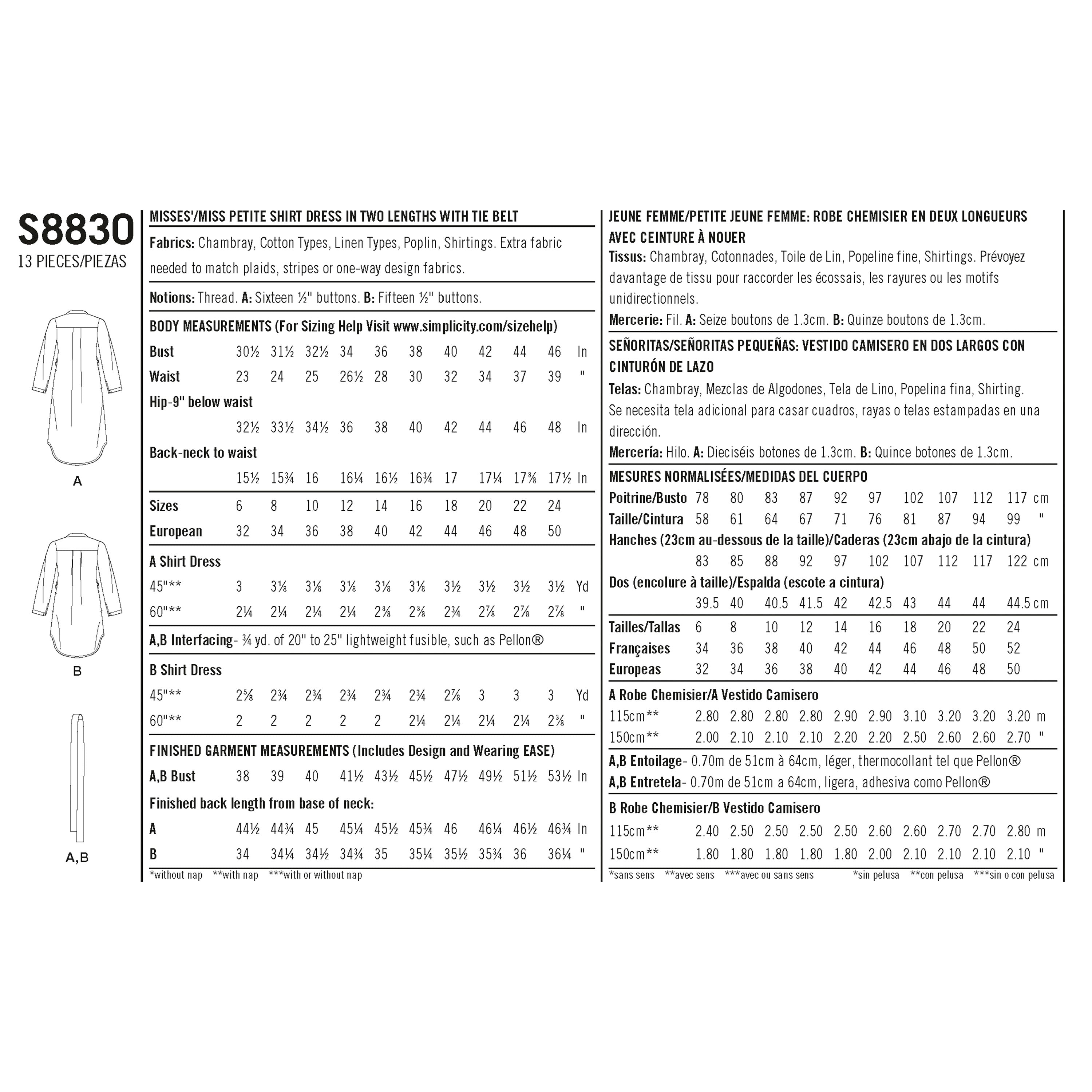 Simplicity Sewing Pattern S8830 - Mimi G Misses'/Miss Petite Shirt Dress