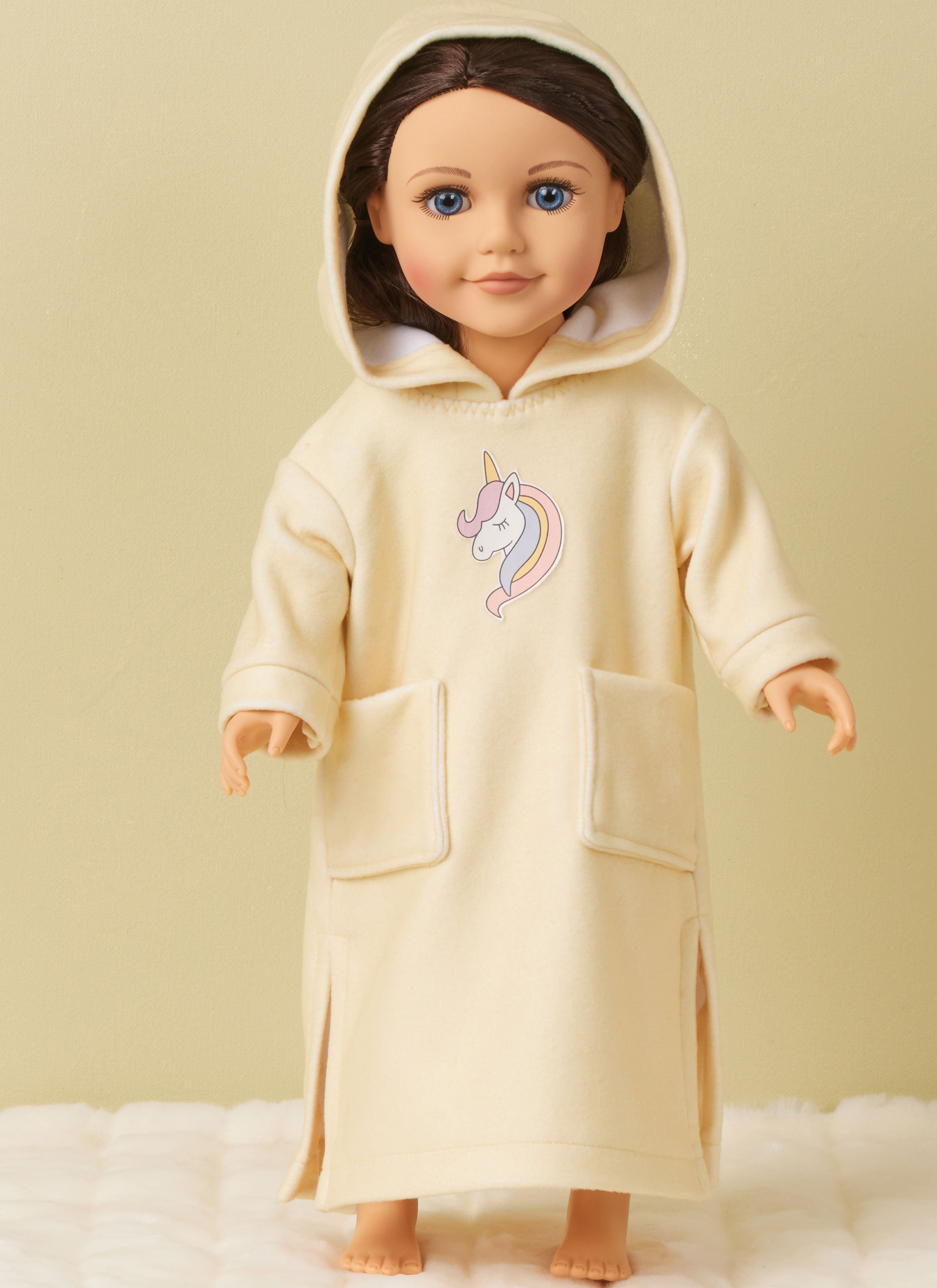 Babydoll pajama top and nightgown have full skirt gathered to raised waistline, shoulder straps and back hook and loop closure. Pajama top and matching pull on pants have eyelet trim and purchased applique; nightgown has lace and ribbon trim and bead buttons. Hooded knit top and robe have back hook and loop tape closure, patch pockets and purchased applique or transfer. Knit leggings have elastic waist. Hooded robe has patch pockets, tie belt and bear ears. See envelope for more information.