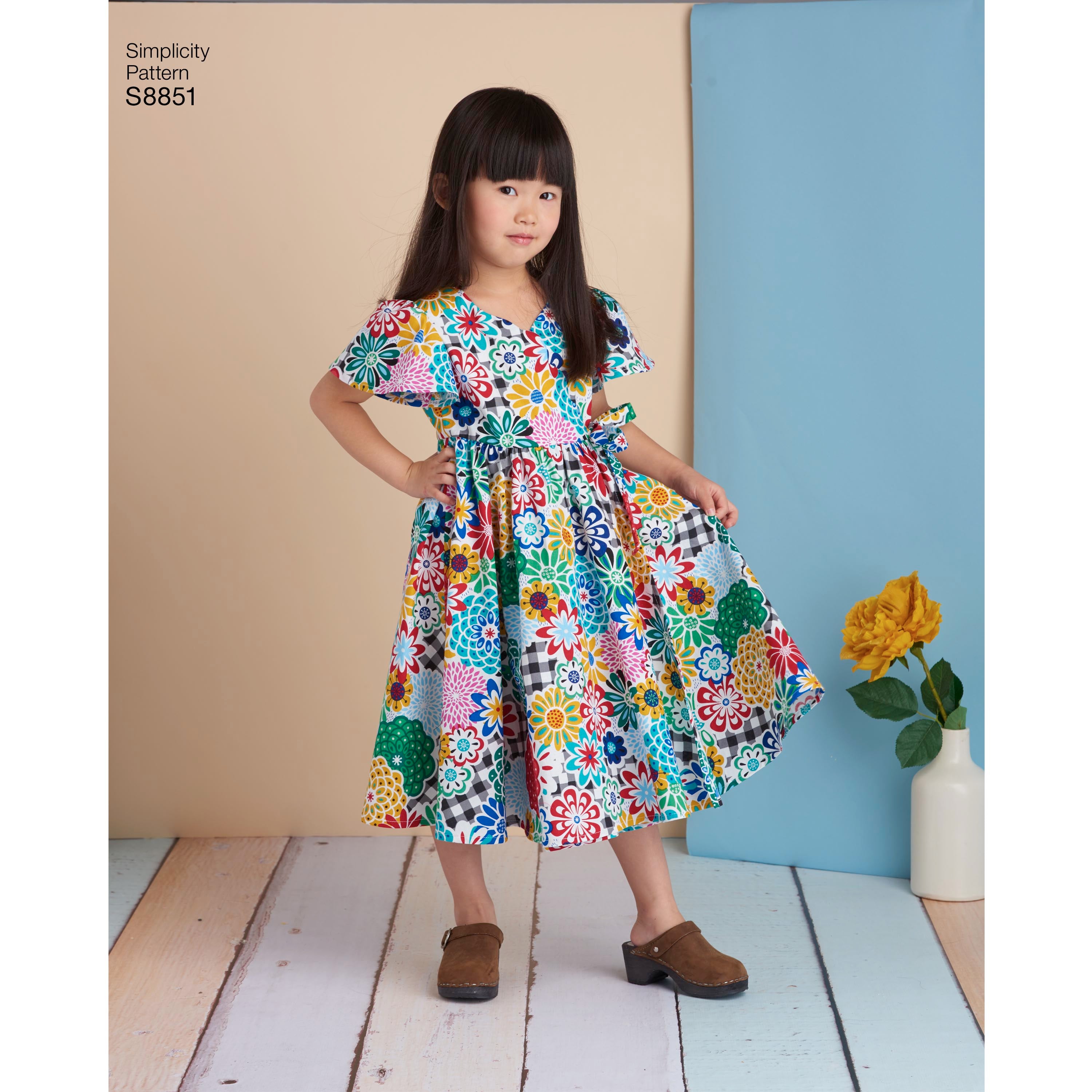 Create the perfect twirl moment with these adorable dresses for child sizes 3-8. All views feature wrap design with full skirt. Dresses include sleeve variations and optional view with contrast godets.