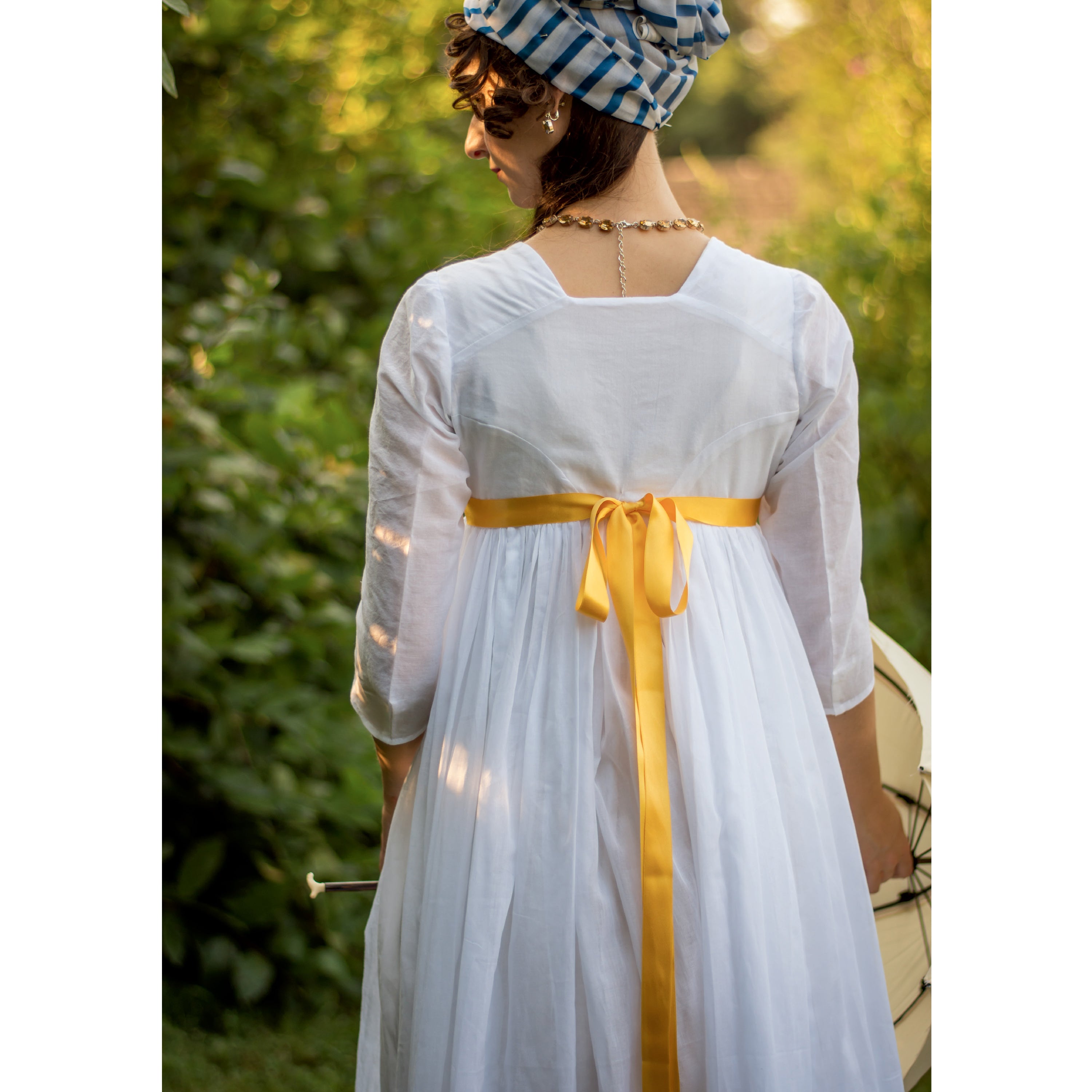 Misses’ costume. High-waisted dress with full skirt and sleeves. Overdress has cutaway front and long sleeves. Hem dips at back.