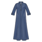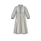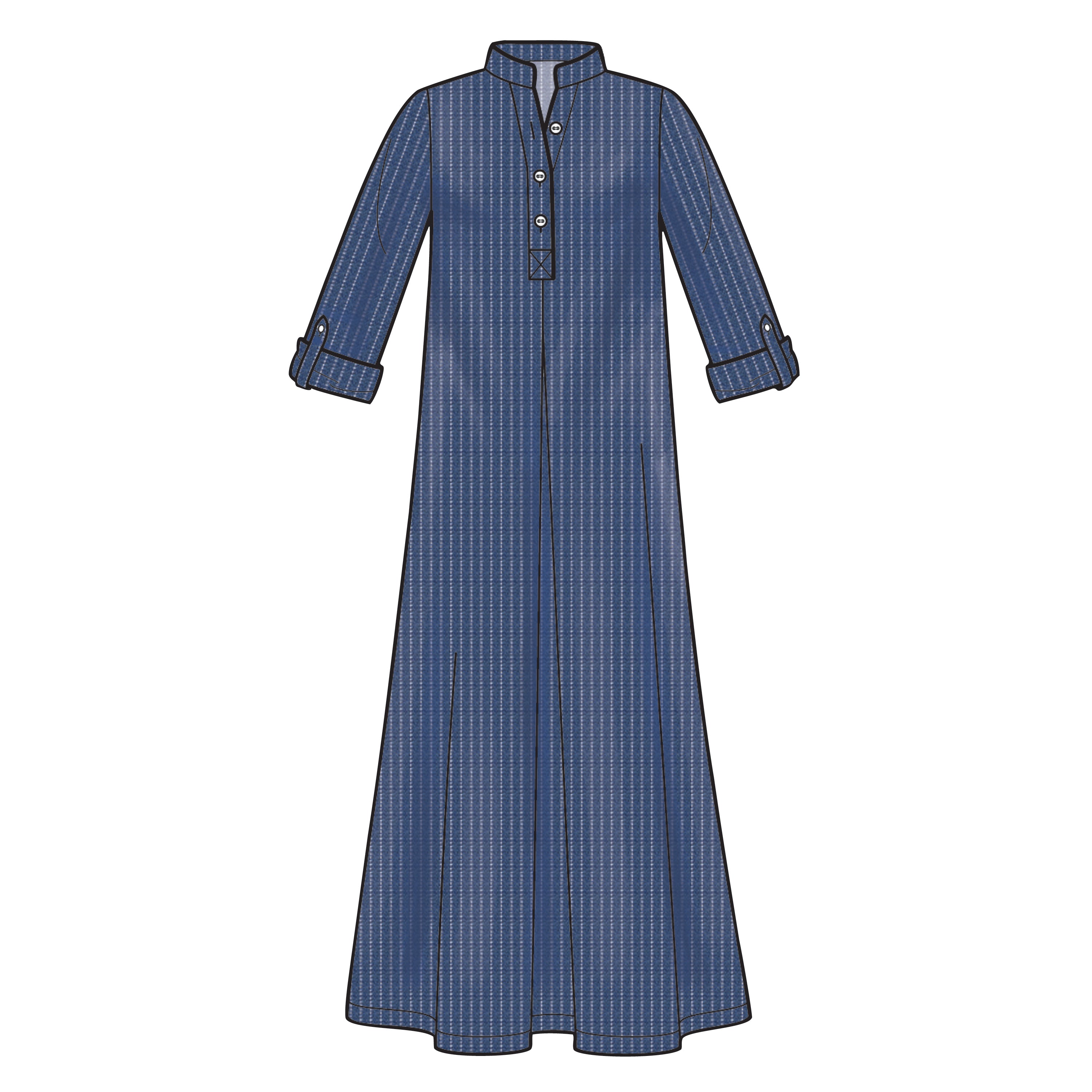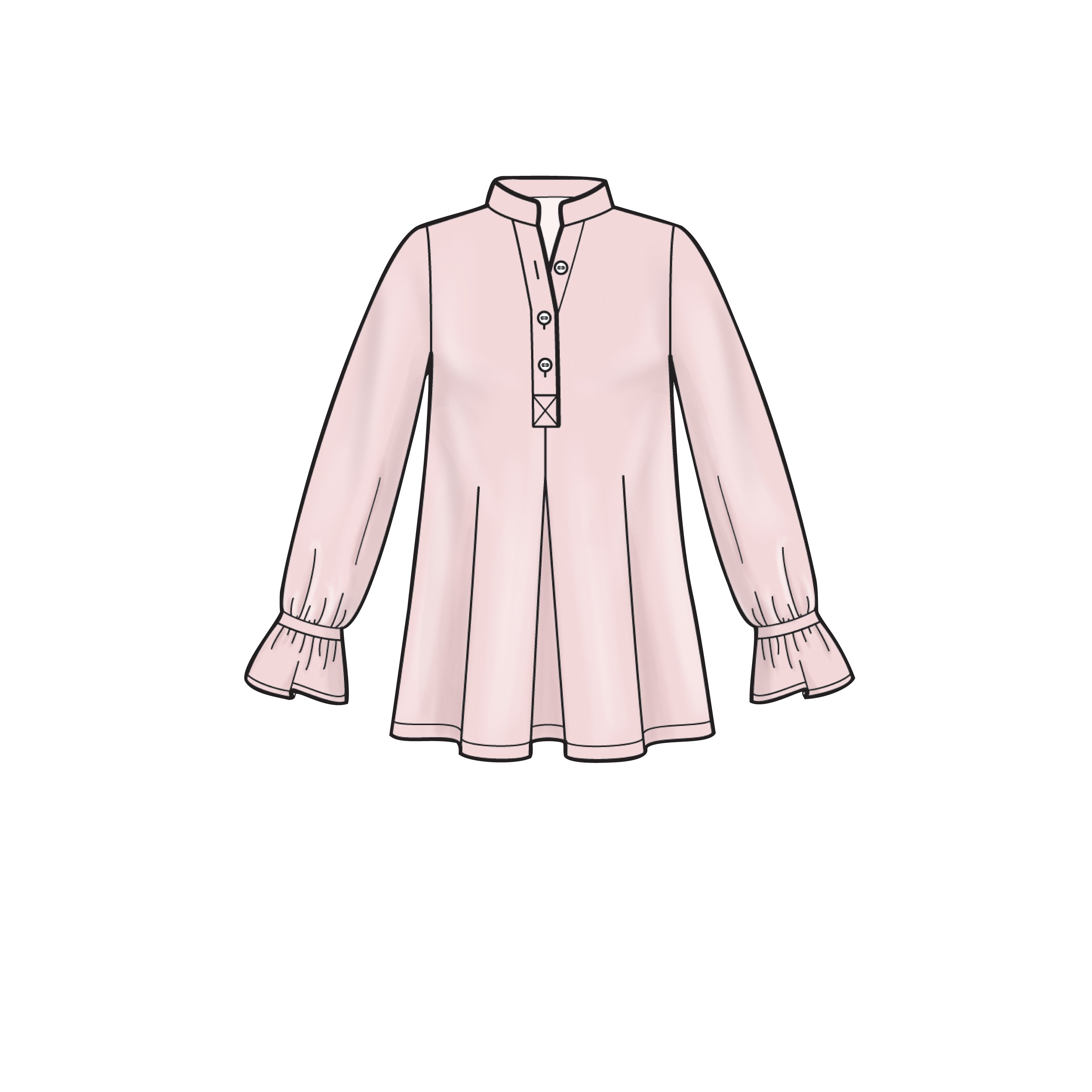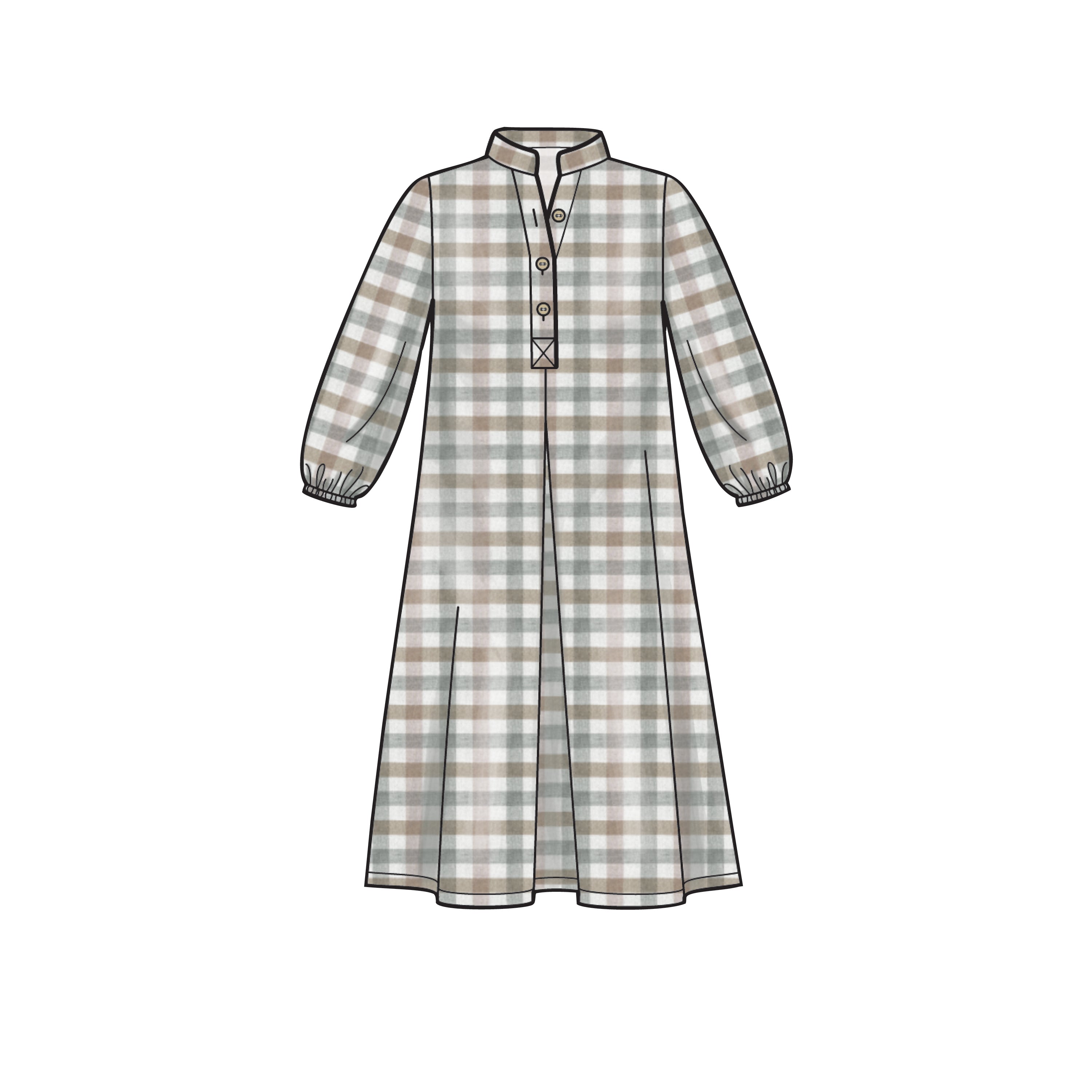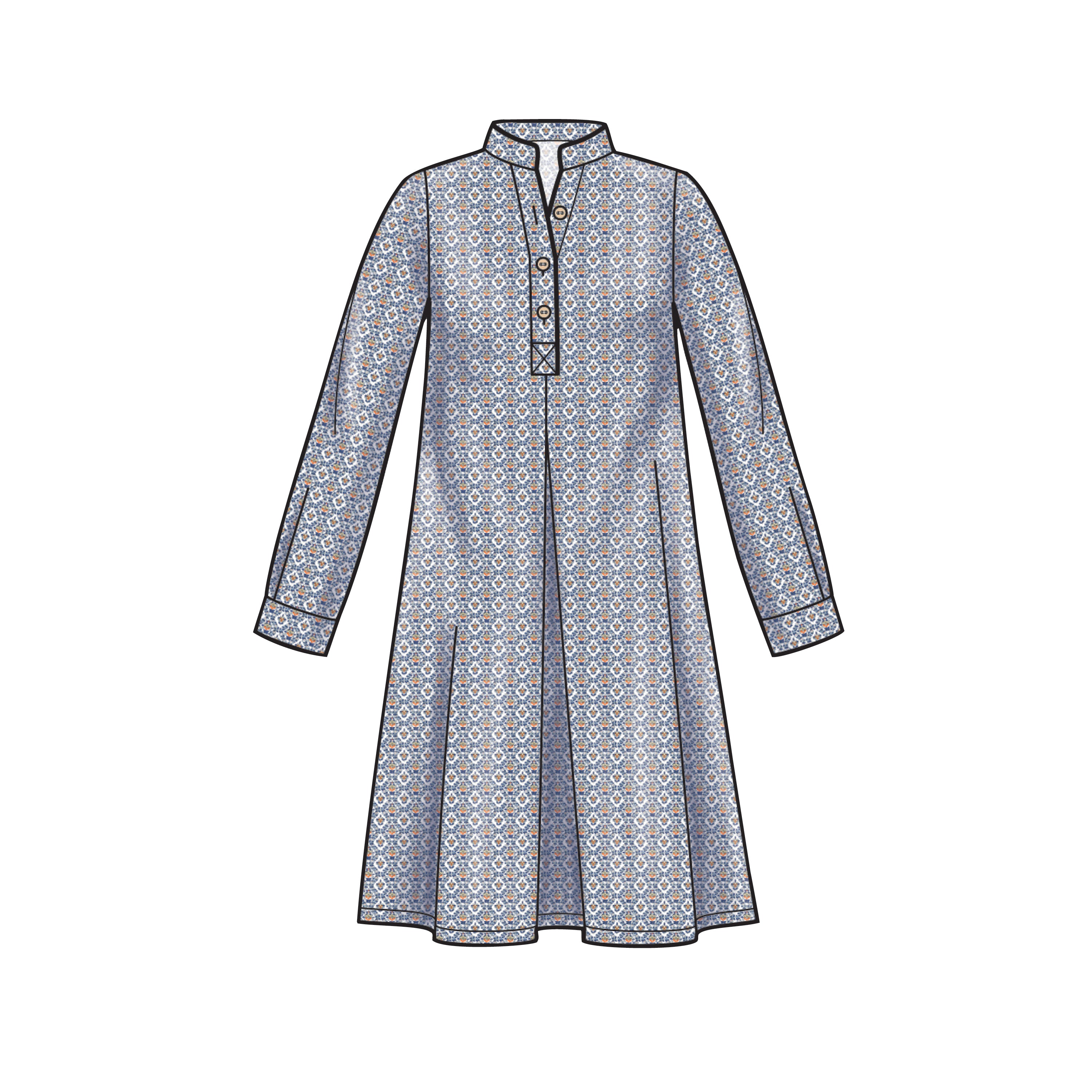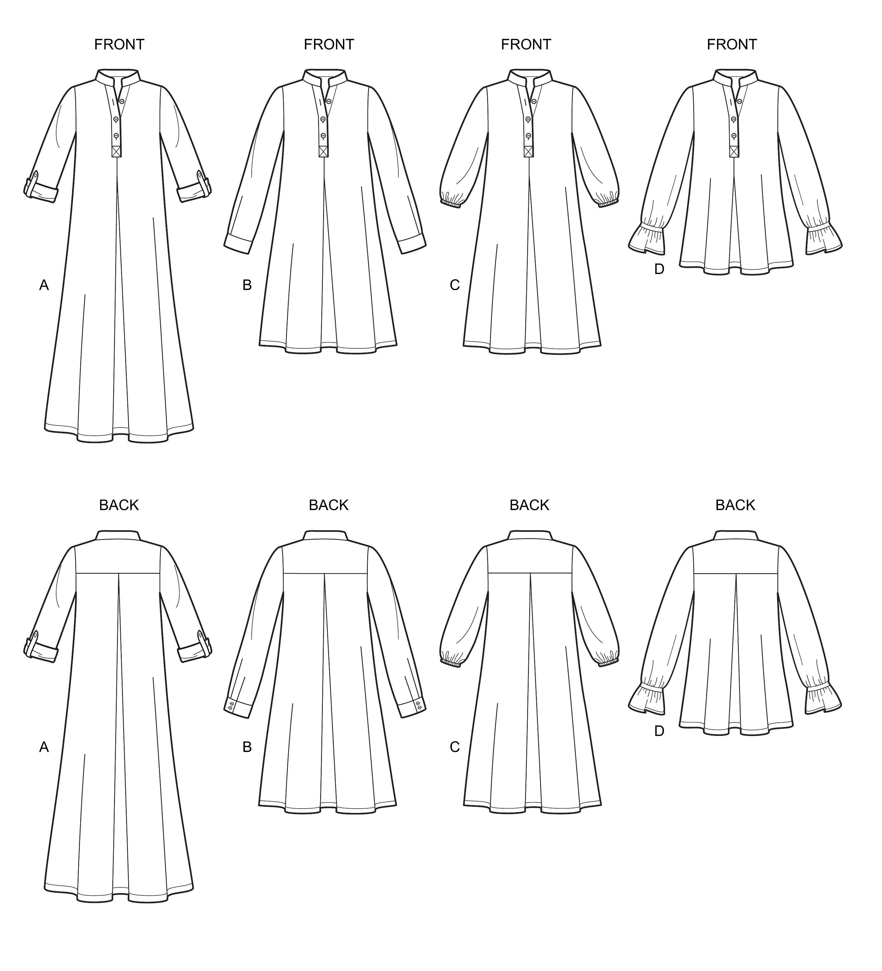 Misses' loose-fitting dress or top with small stand collar, three-button neck fastening and back yoke. Sleeve style and length variations. Suitable for light-to-medium-weight woven fabrics.