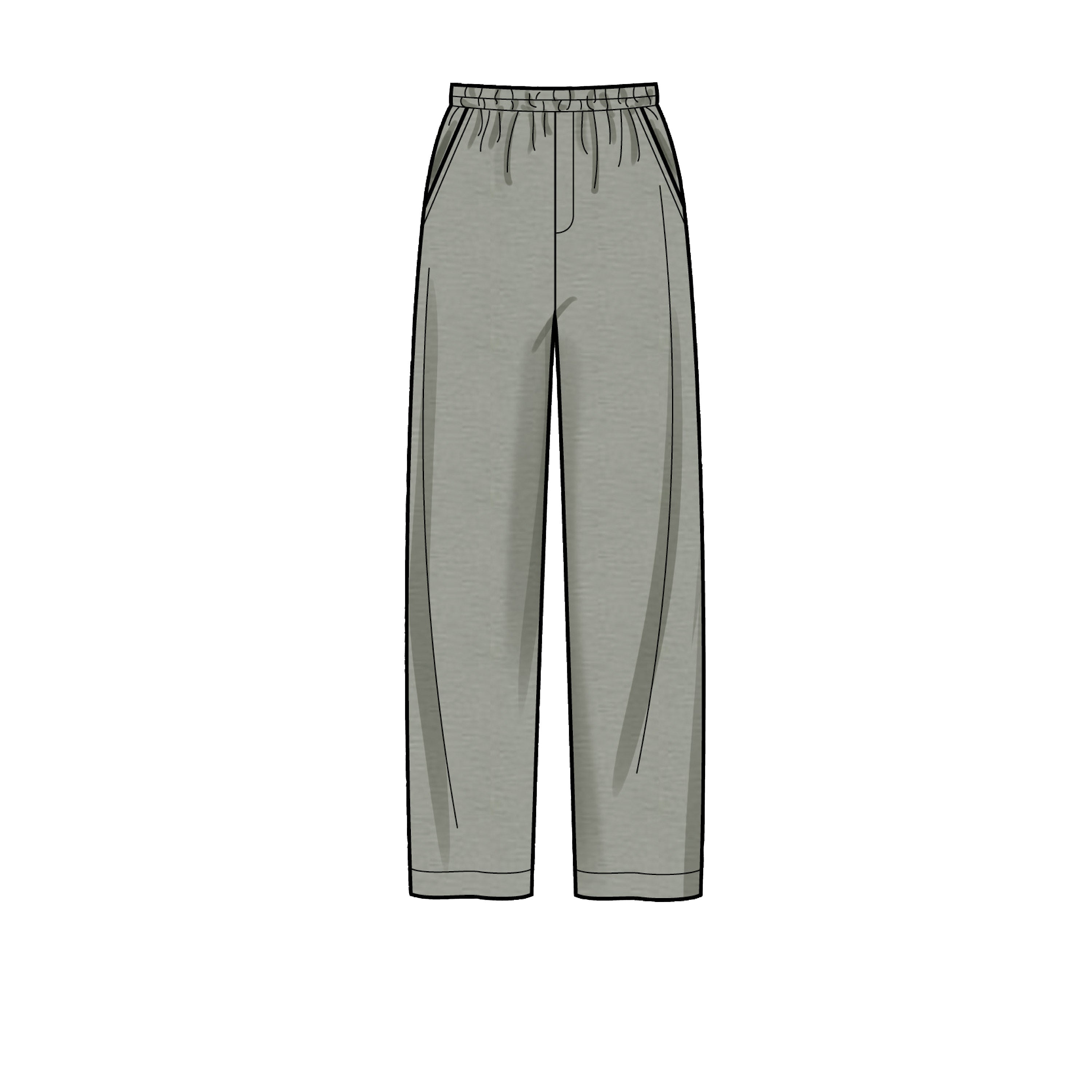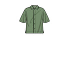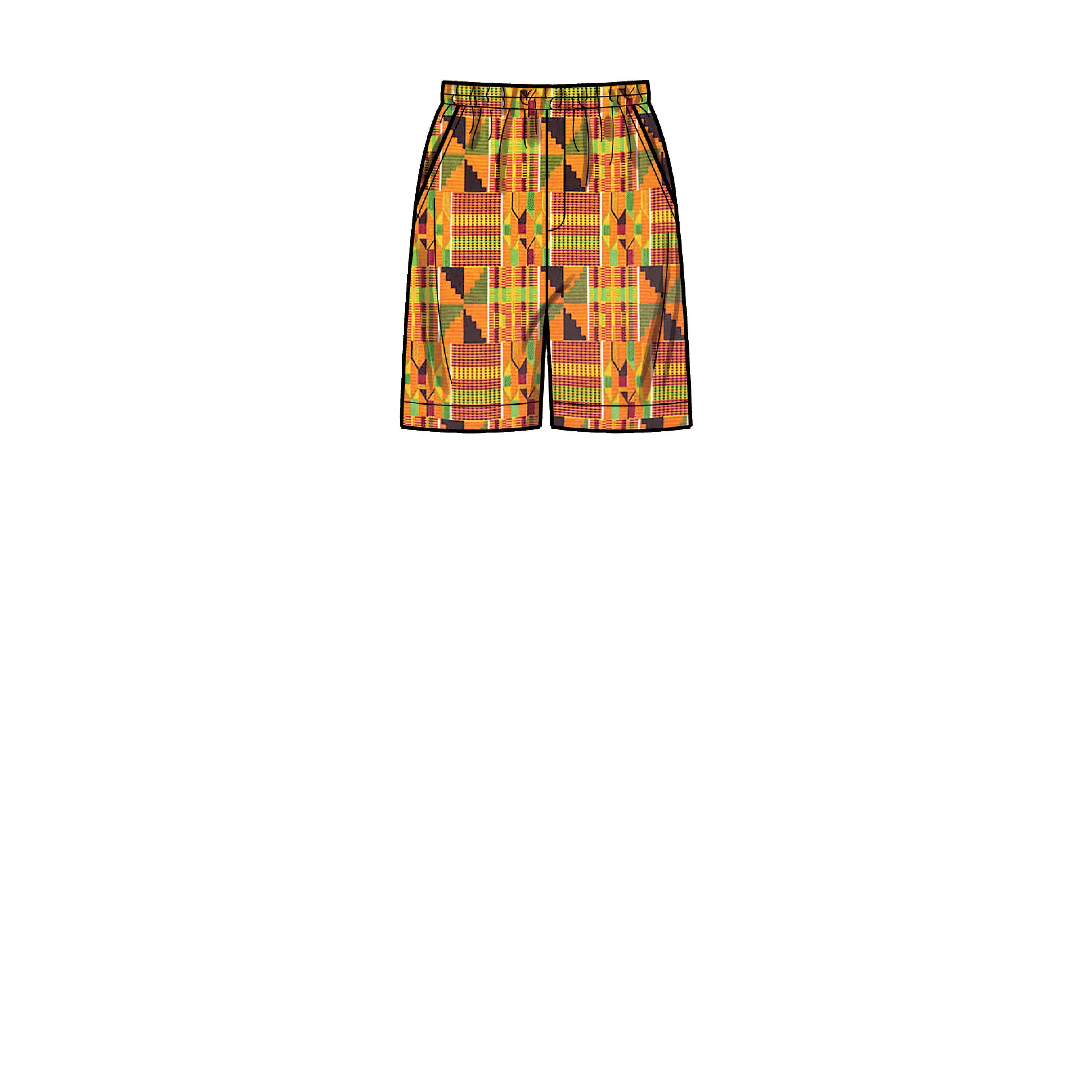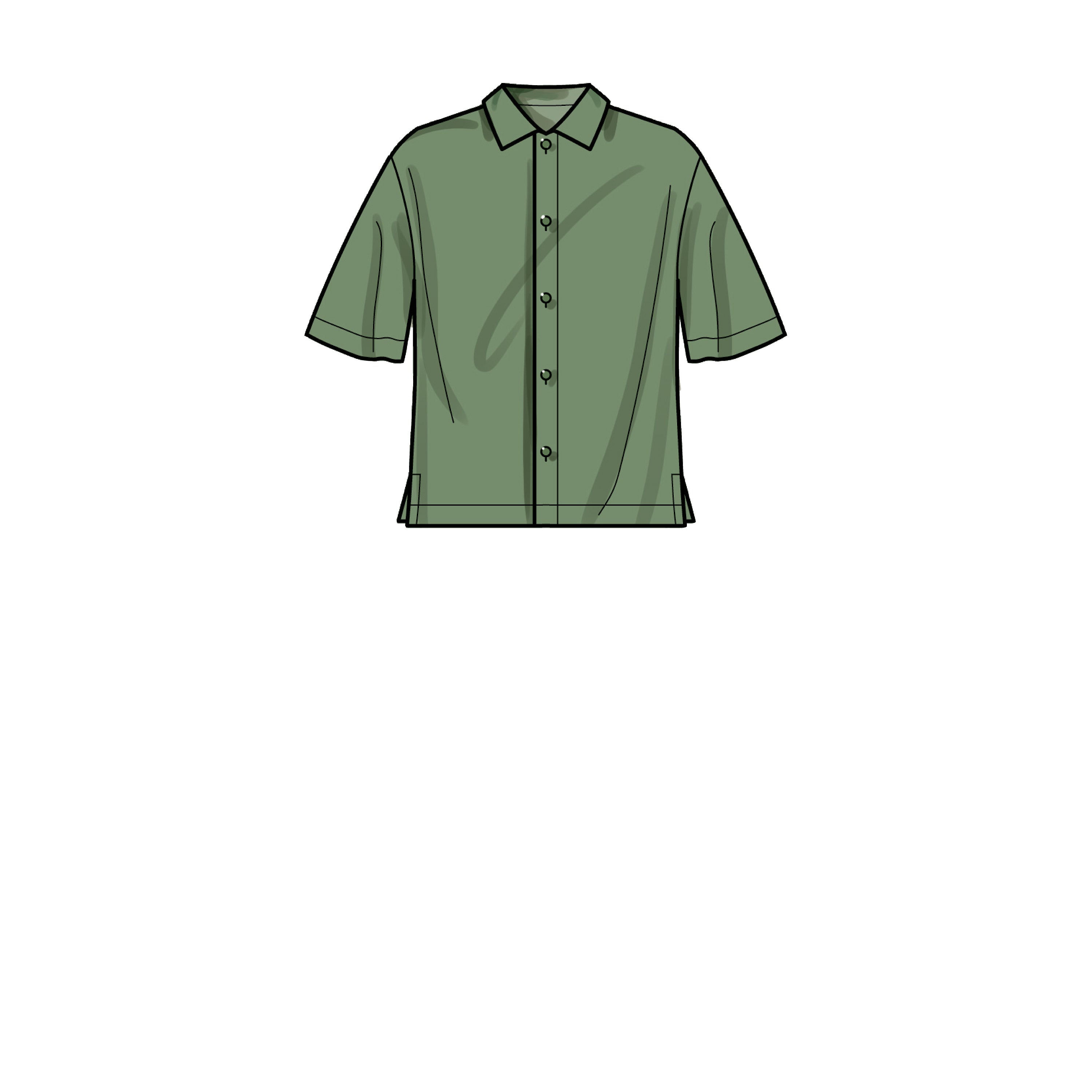 Men's relaxed shirt in two lengths has back yoke, pointed spread collar, elbow length or short sleeves; slightly tapered pull-on pants or shorts.