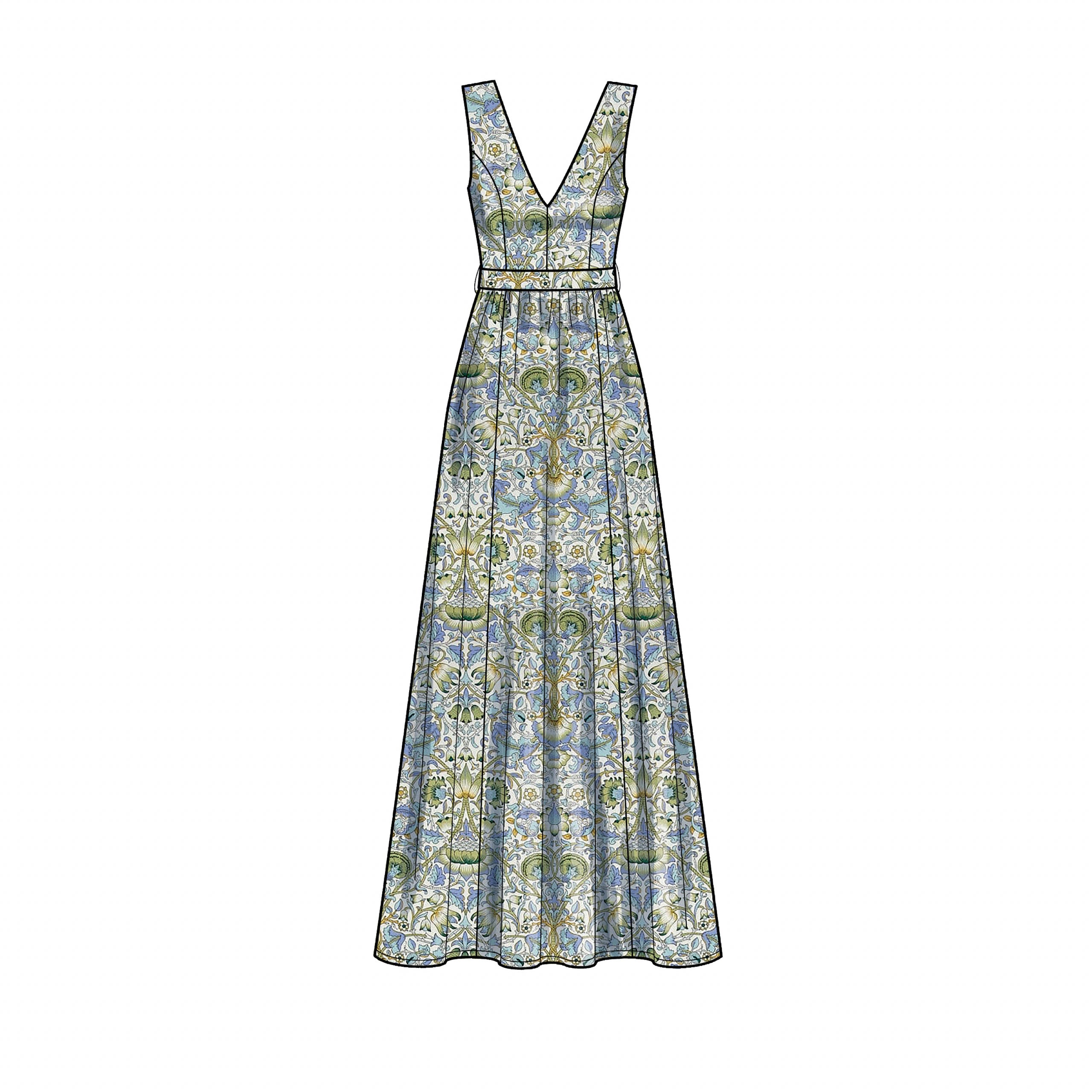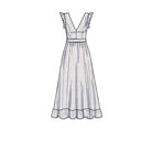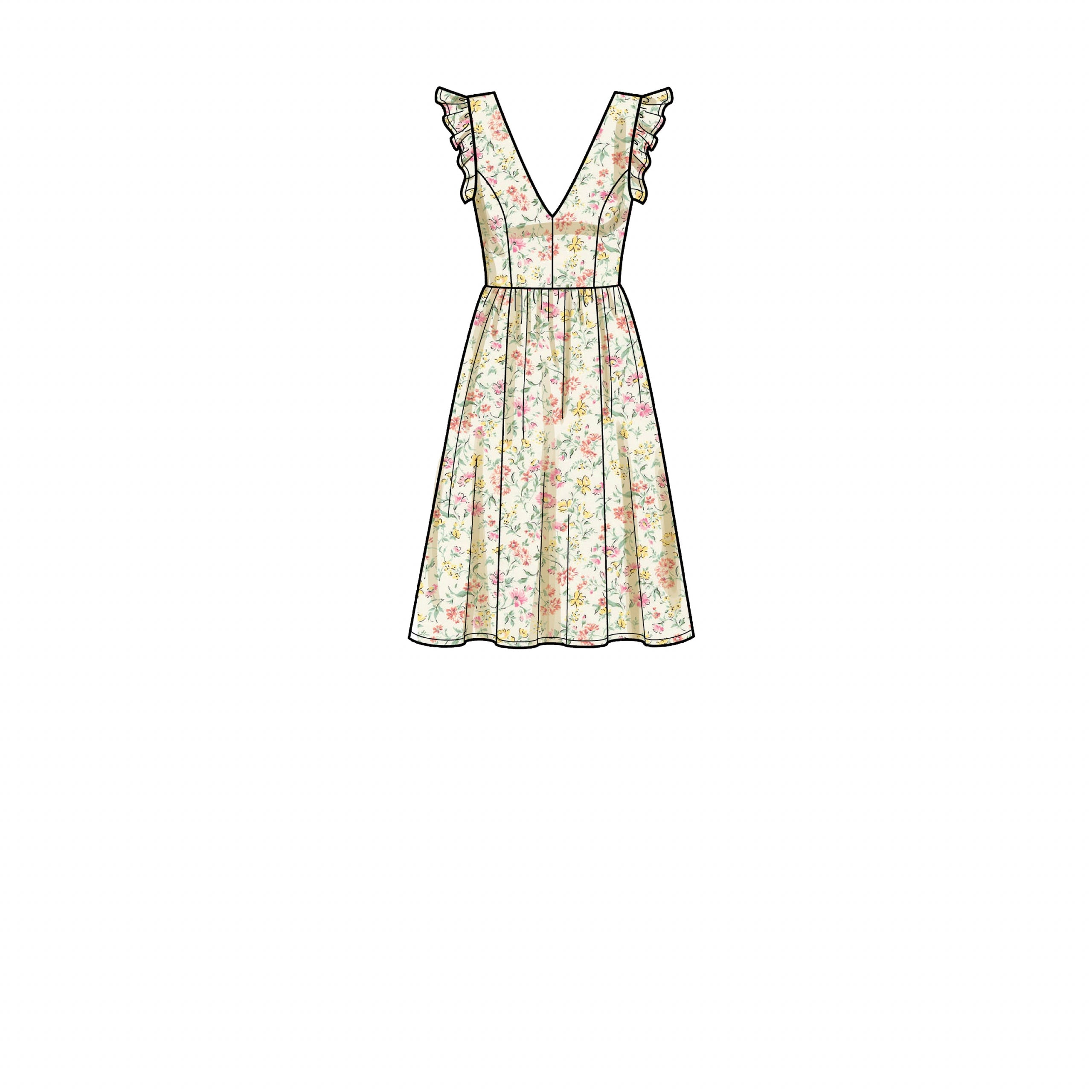Misses’ dresses with princess-seamed front bodice, plunging front and back neckline, waist gathers and sleeveless or flounce sleeve variations. Three length options.