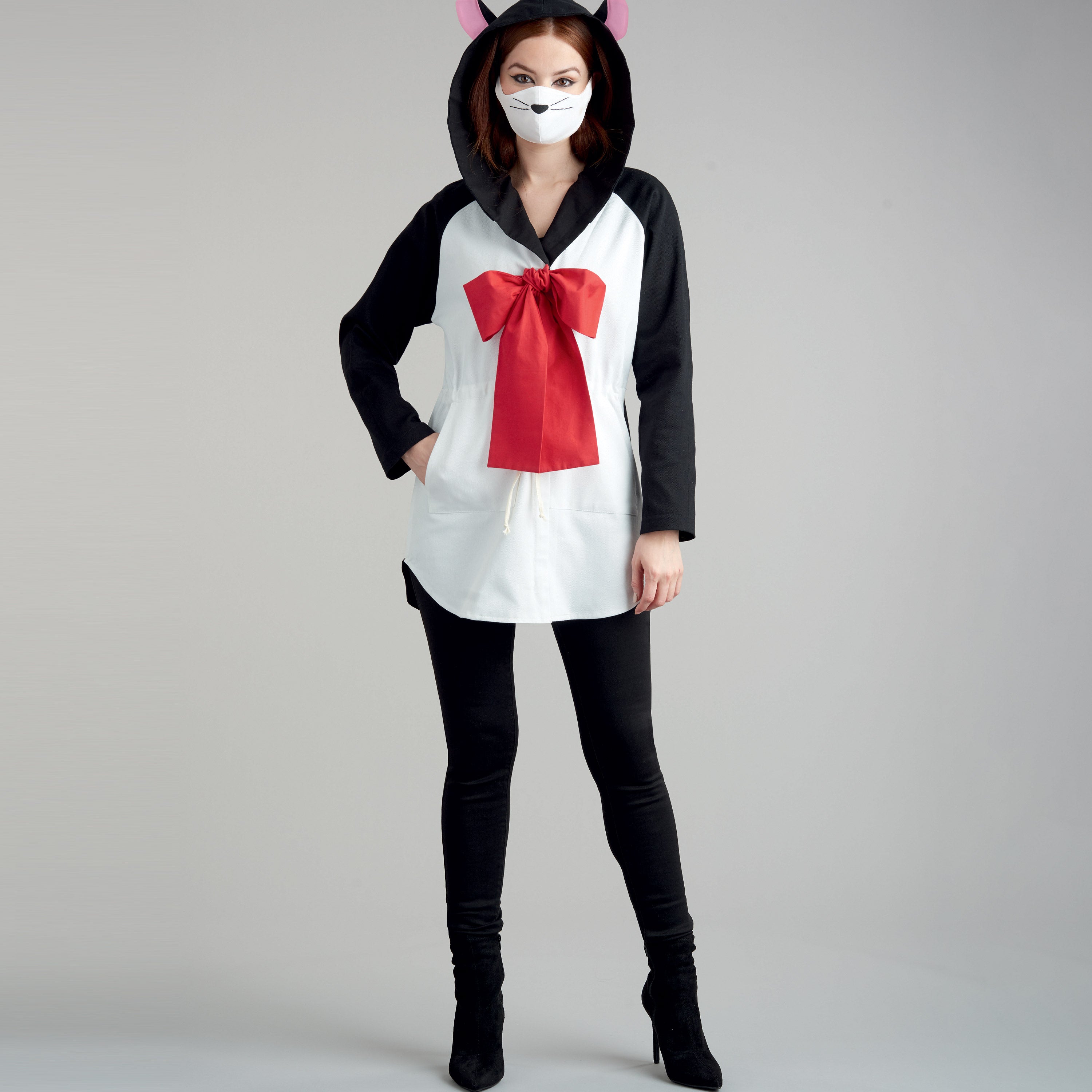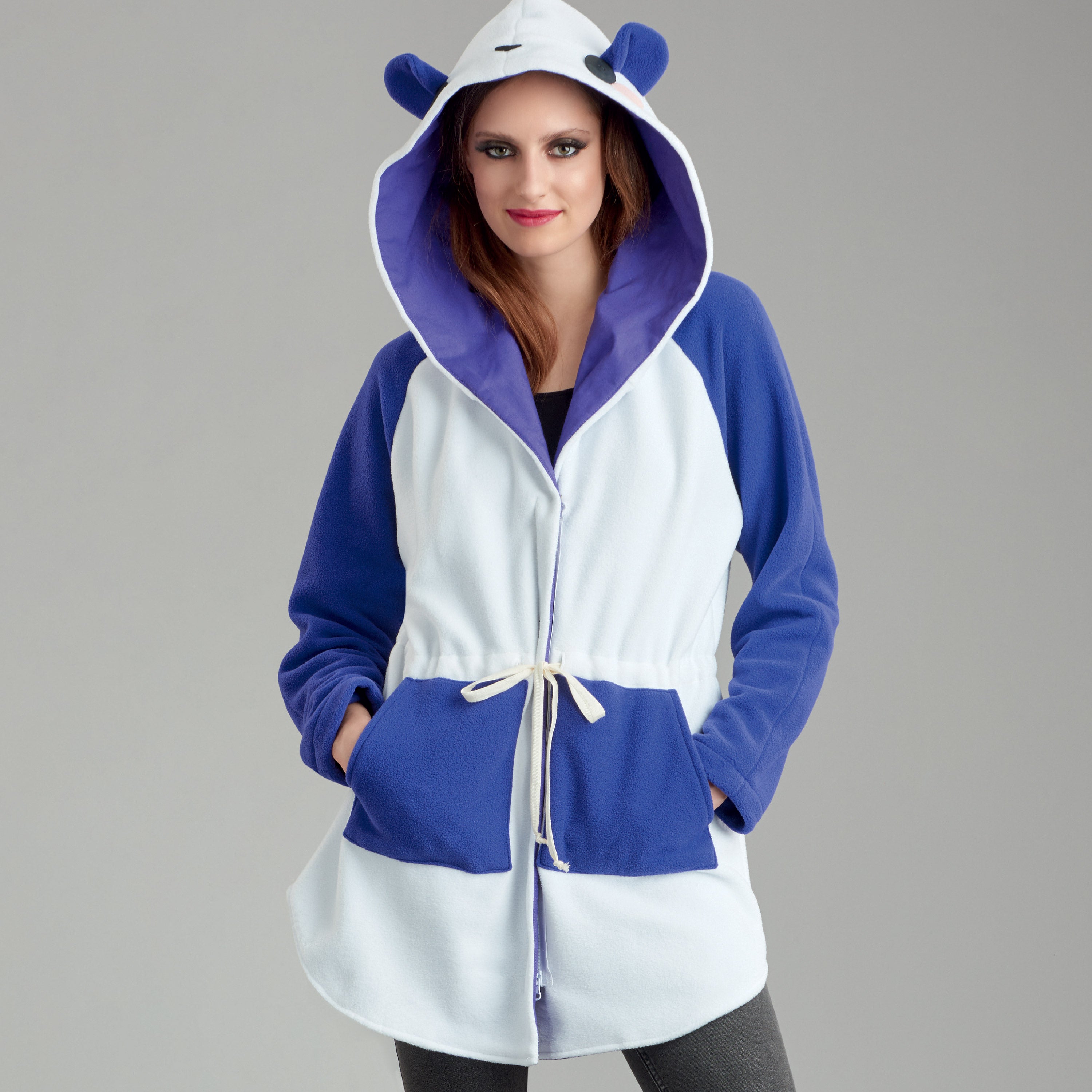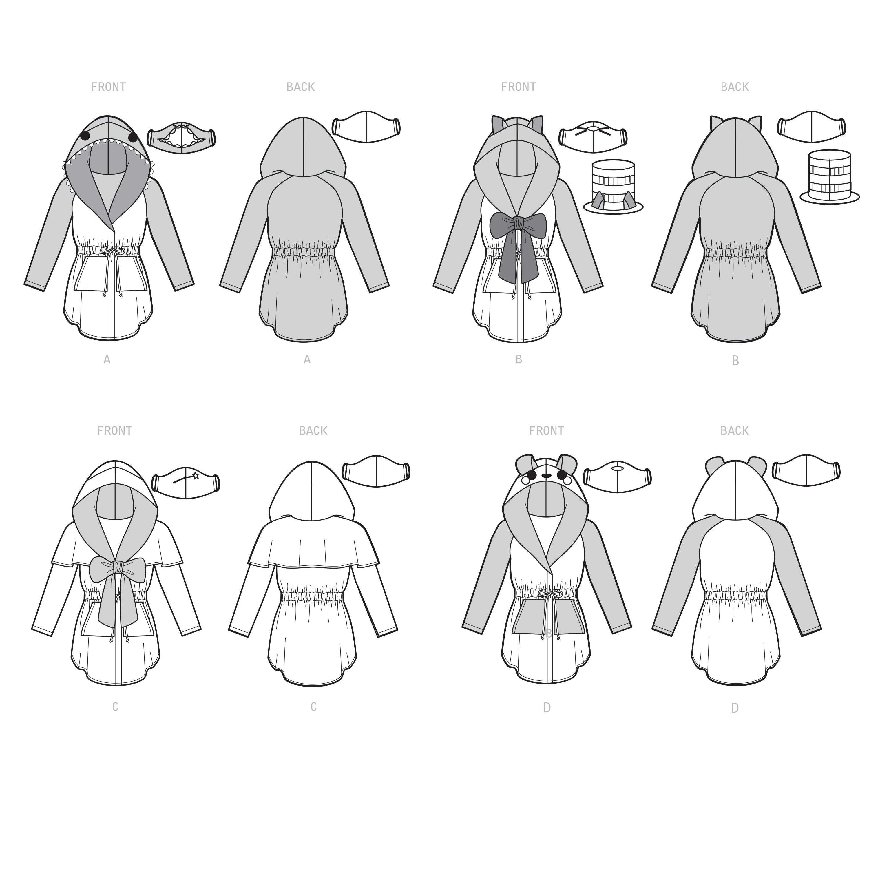 Hooded anorak has raglan sleeves, front separating zipper closure and ties to cinch your waist. Add fun details to create a Shark, Panda, Cat and Enchanting Godmother. Pattern includes a tall hat with cat ears. Masks have appliques to coordinate your costume.