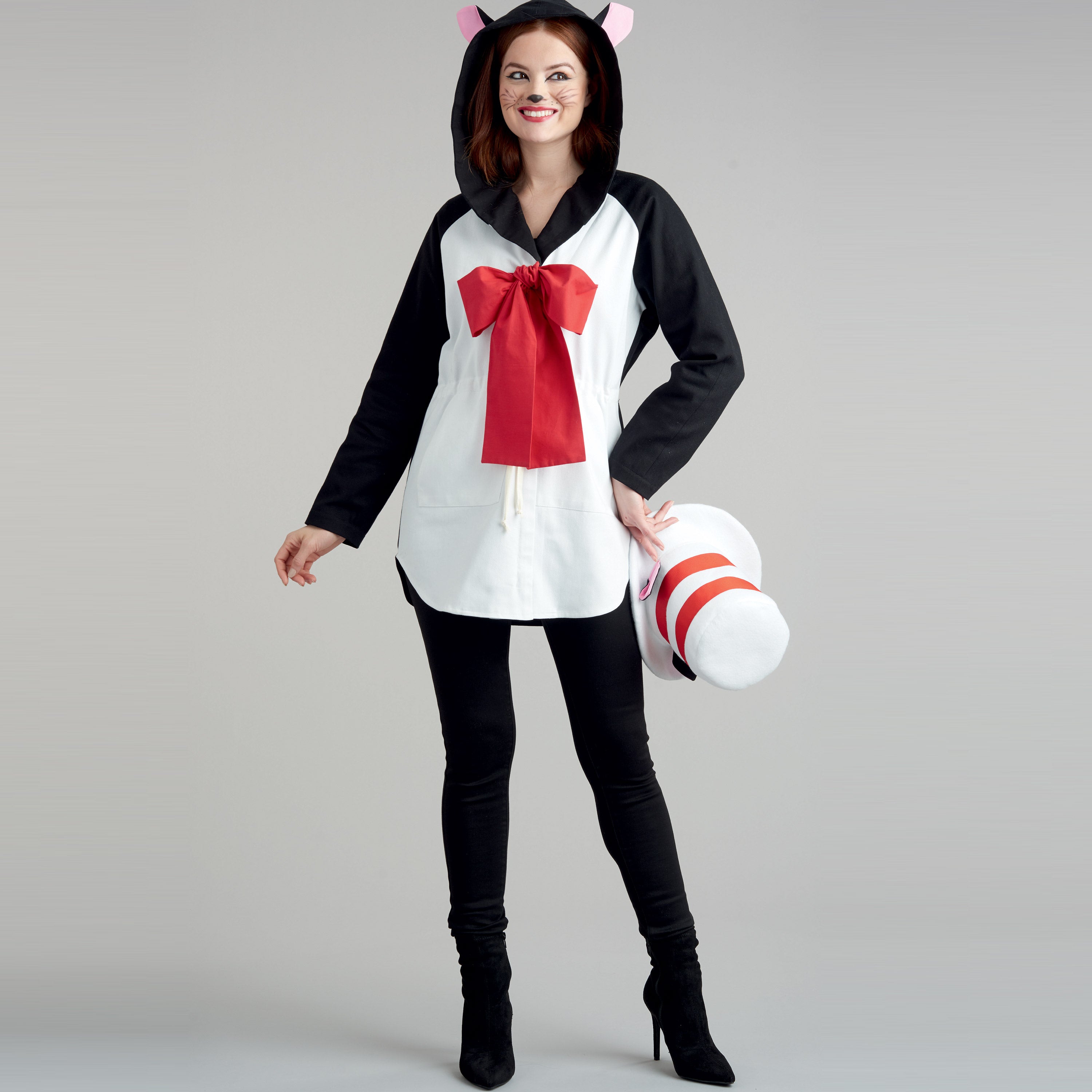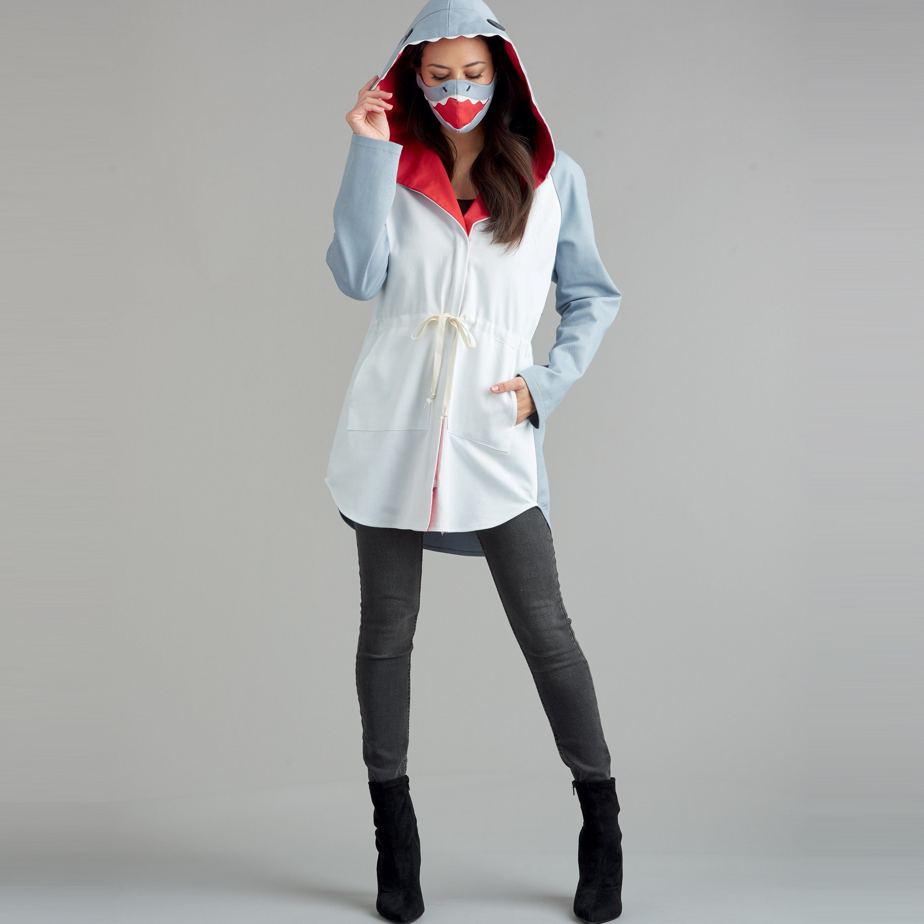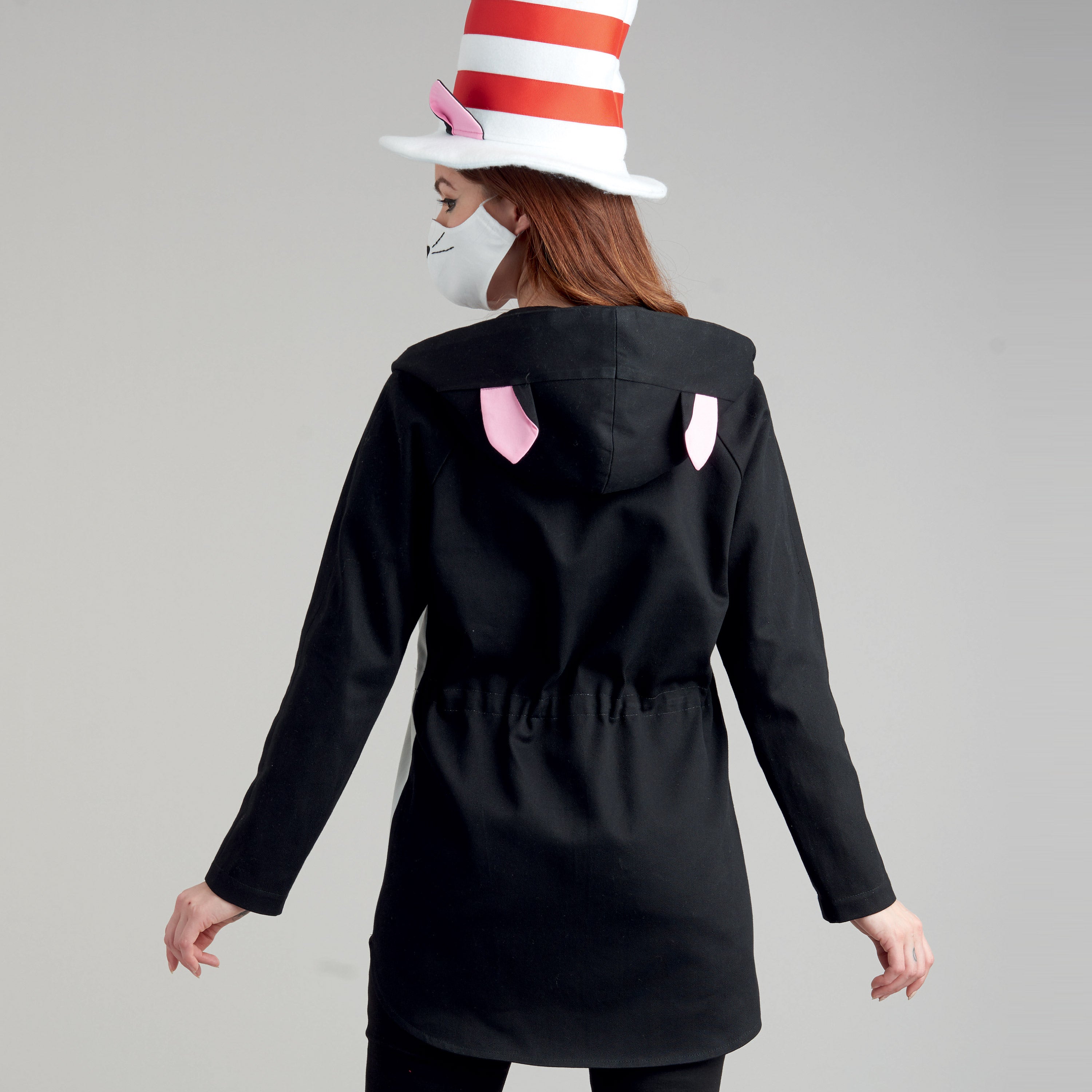 Hooded anorak has raglan sleeves, front separating zipper closure and ties to cinch your waist. Add fun details to create a Shark, Panda, Cat and Enchanting Godmother. Pattern includes a tall hat with cat ears. Masks have appliques to coordinate your costume.