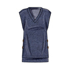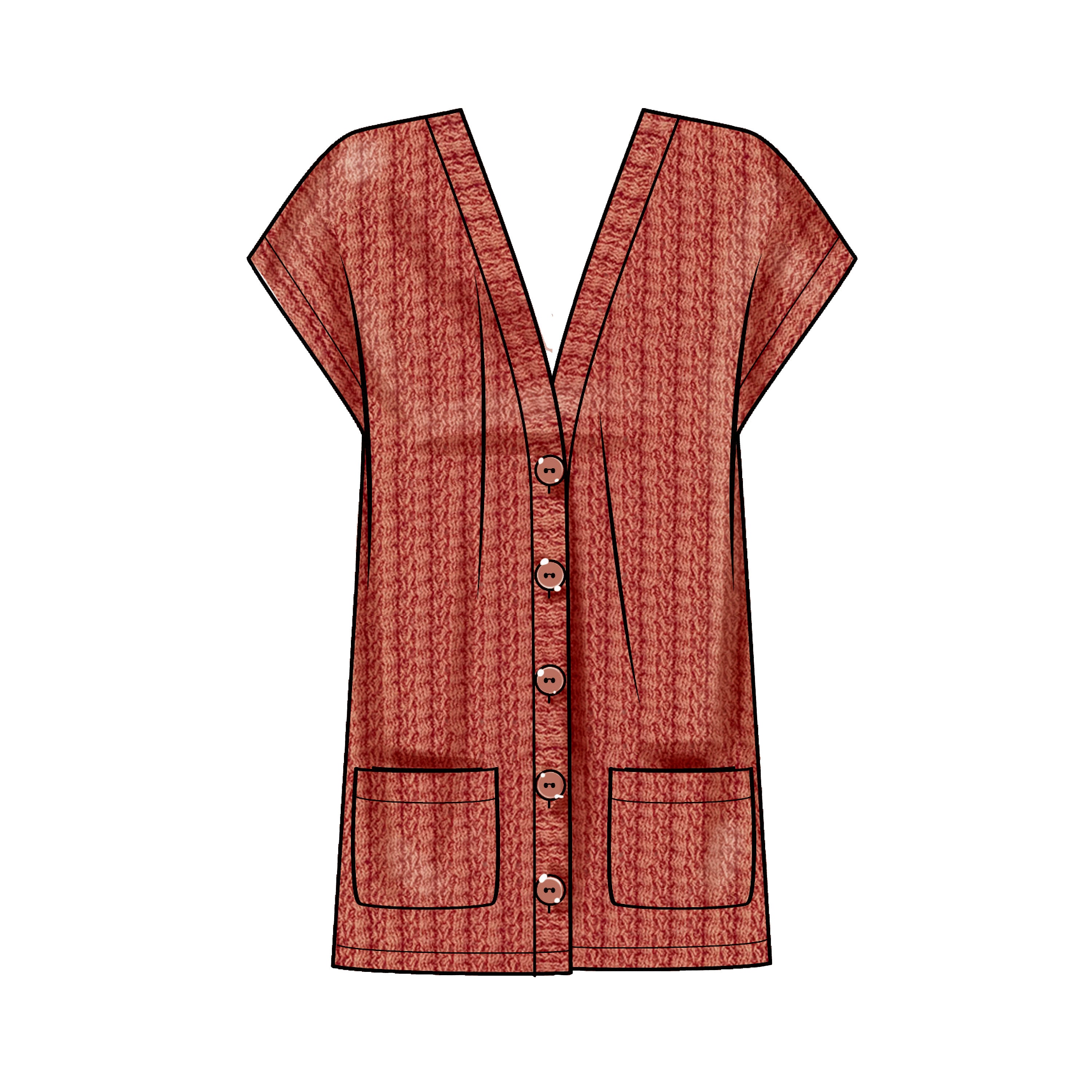 Knit button front vests in two lengths; longer view features front patch pockets. Pull-on V-neck vests with high-low hem and side buttons or with self band at waist.