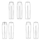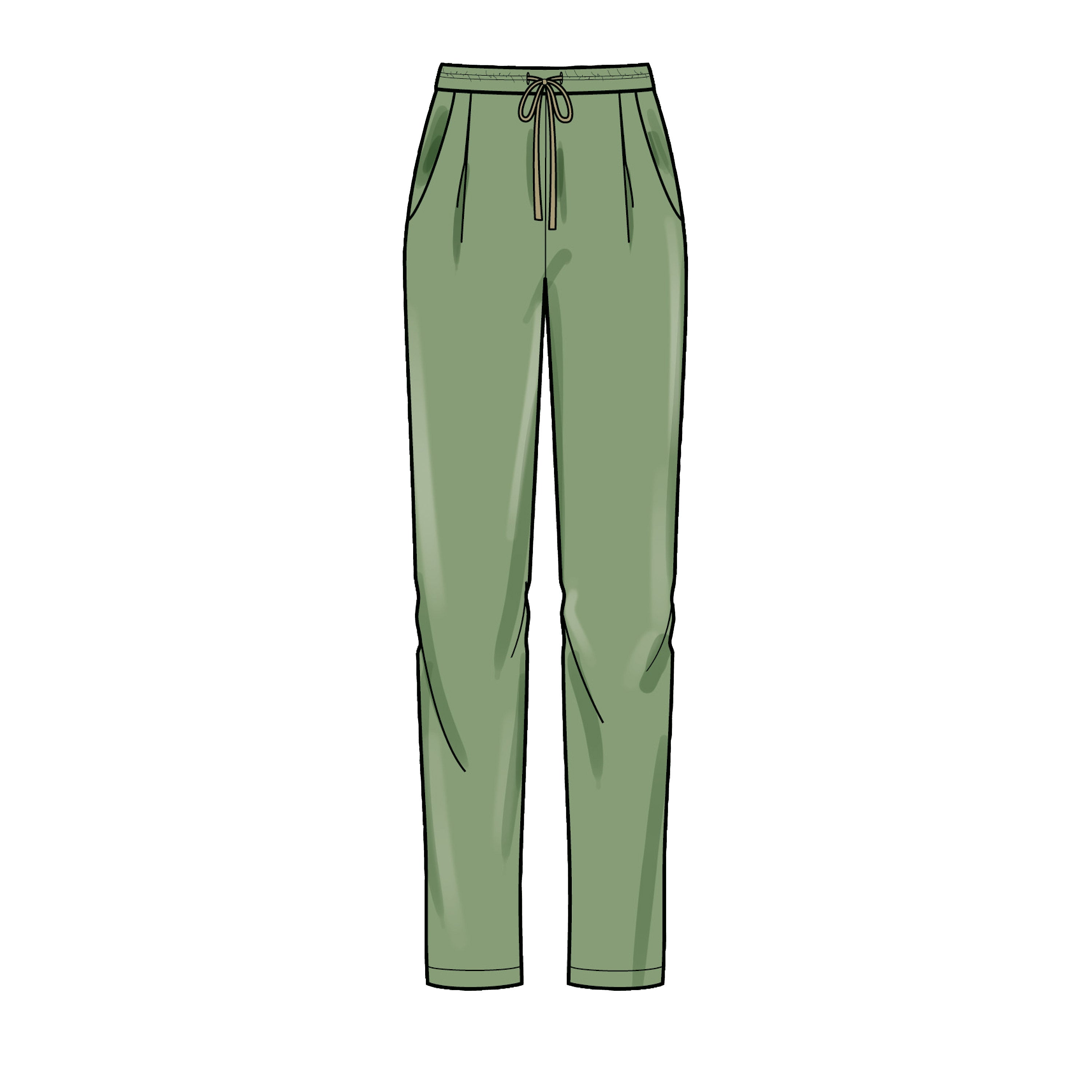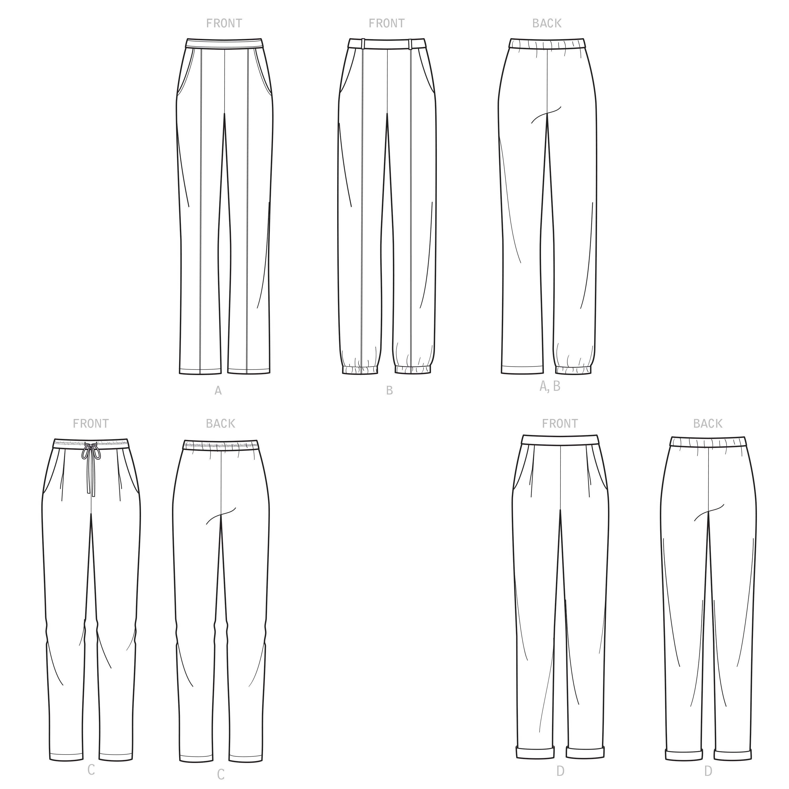 Variations for pleats or pintucks all with side front pockets. Options for waist ties, belt loops and top stitching. Clean finish hems, cuffs or elastic.