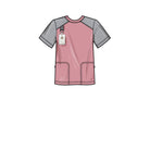 Scrub tops have round neckline, shoulder yoke, zippered pockets, badge holder; one view offers contrast fabric layout. Pull-on pants are straight leg with pocket details; mask and cap included.
