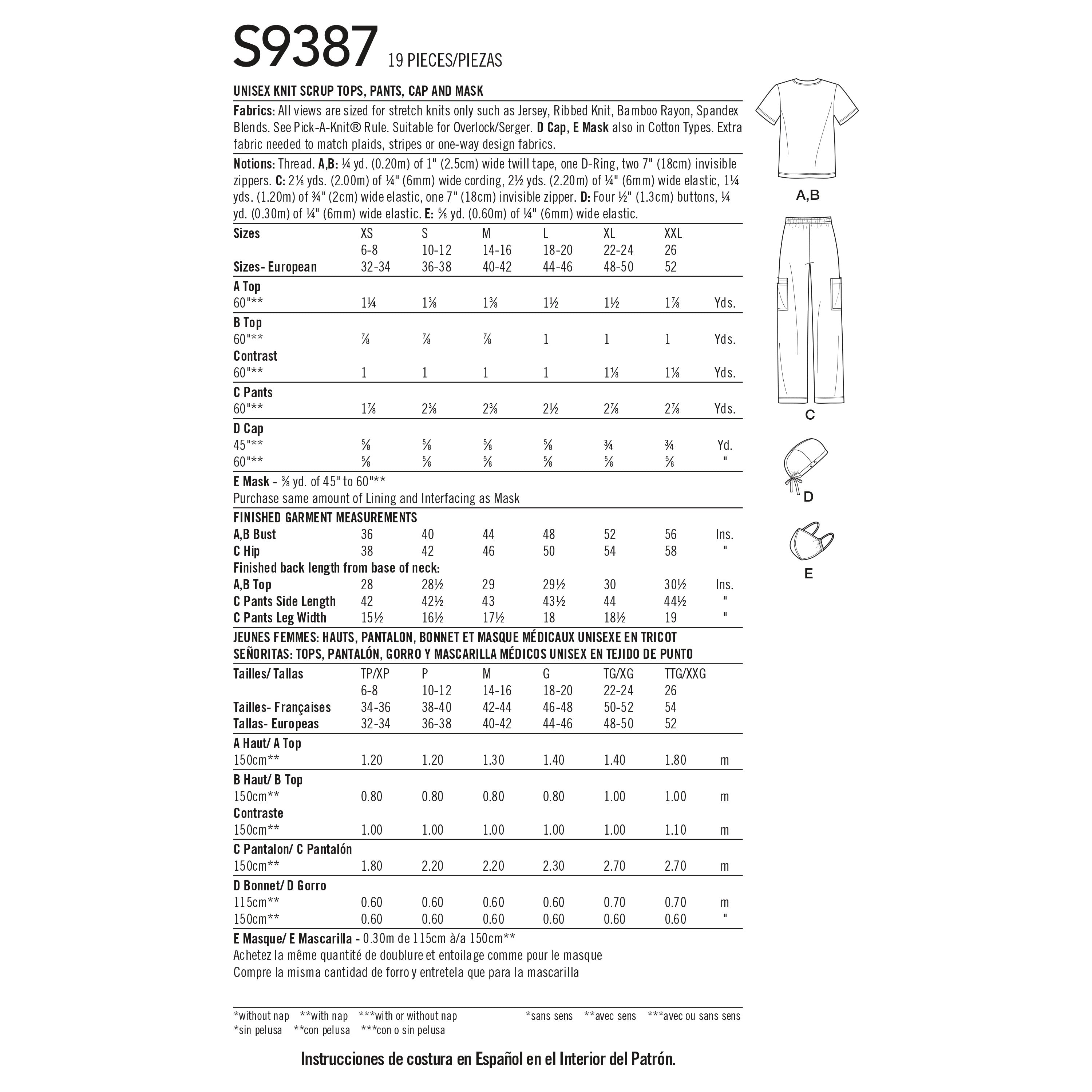 Simplicity Sewing Pattern S9387 - Unisex Knit Scrub Tops, Pants, Cap and Mask