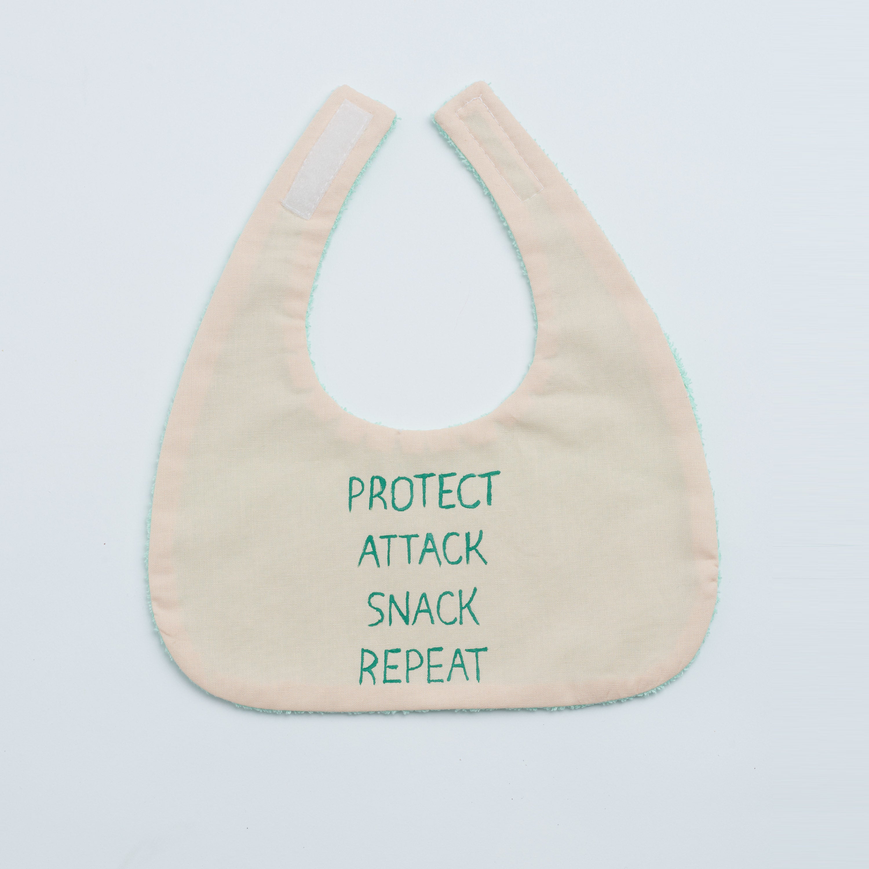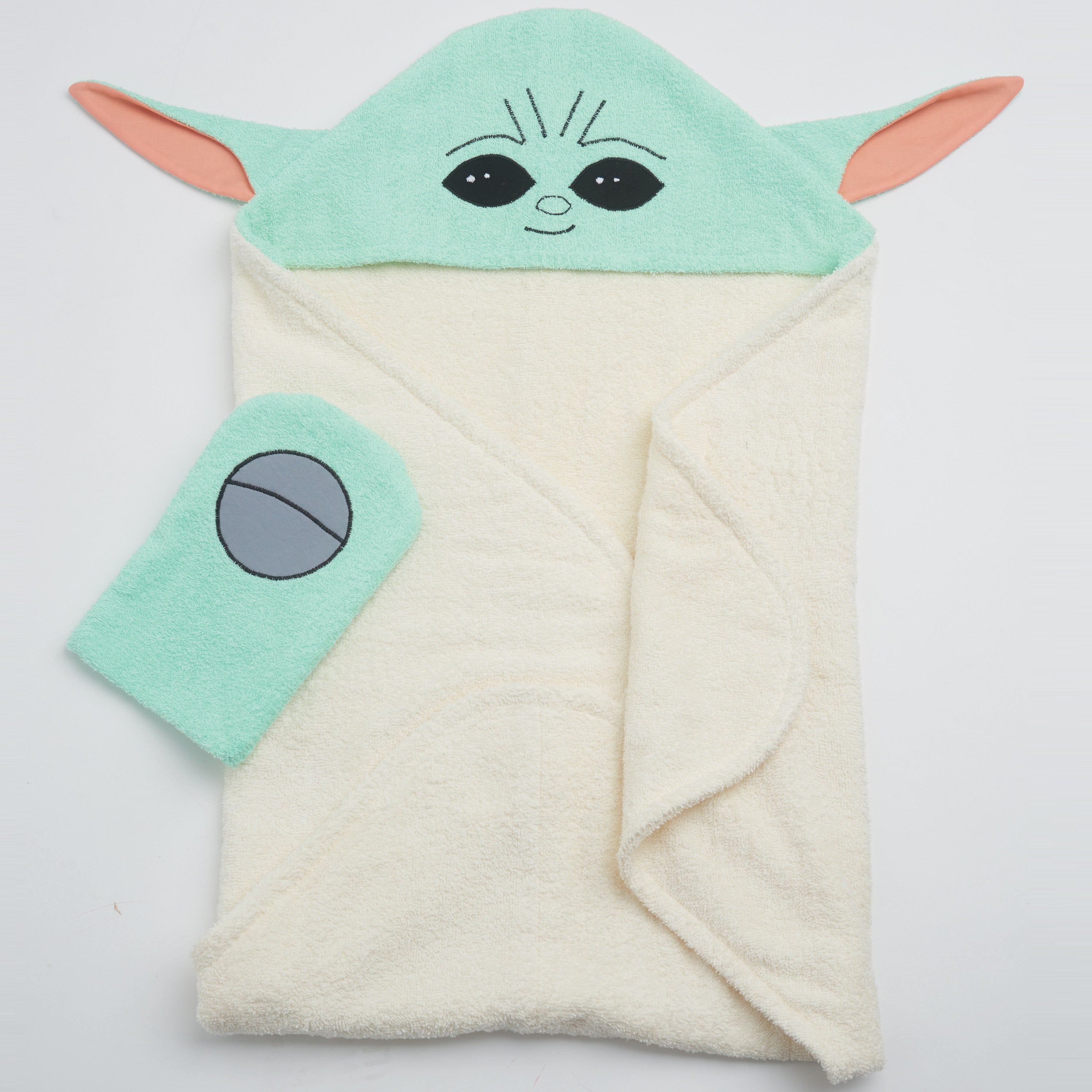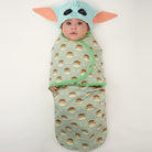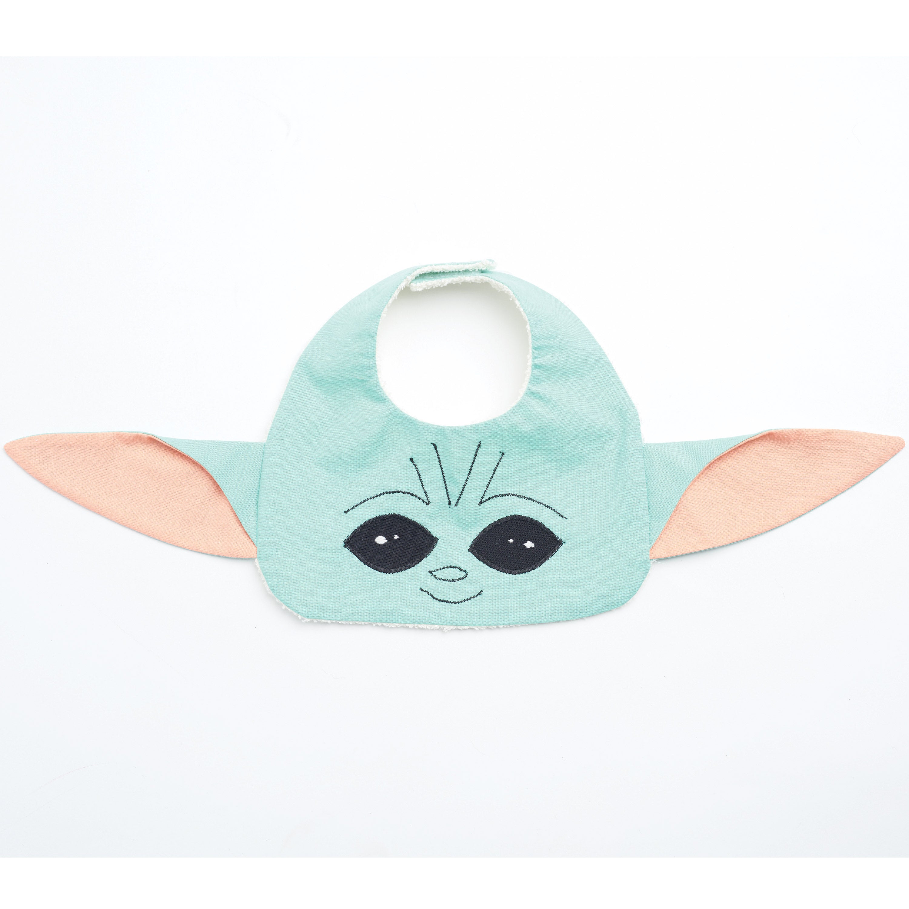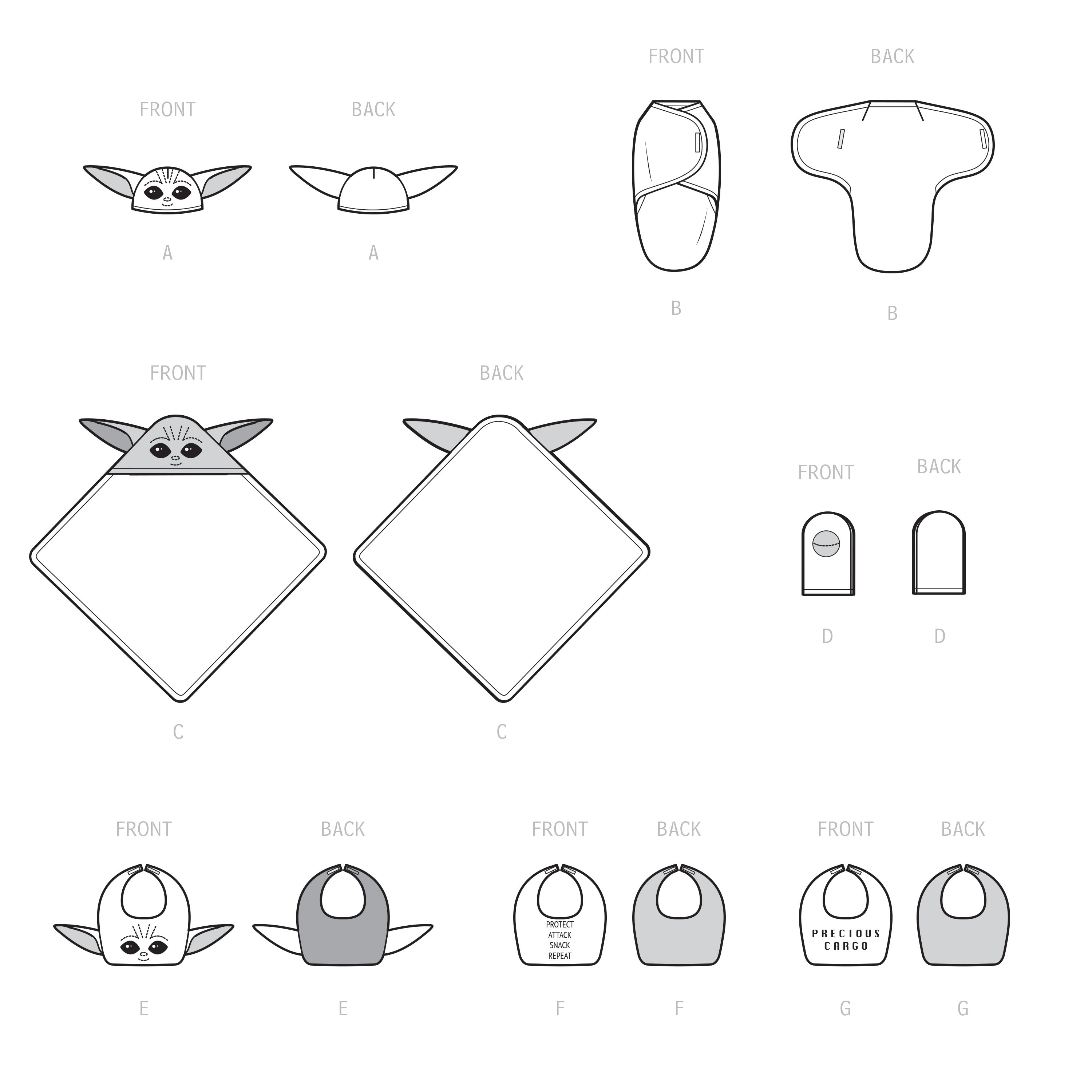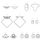 Gifts for your precious cargo - knit hat in 18", 19" and 20" hat sizes has 3D ears and Grogu character face. Lined swaddle sack has hook and loop closed flaps and bias-bound edges. Hooded baby towel is sewn from two absorbent layers of terry cloth and features Grogu face and ears. Self-lined bath mitt is sized for adult hands and has sphere applique, Grogu's favorite toy! Generously-sized bibs have absorbent terry cloth lining, hook and loop closure at neck and Grogu face and ears or hand-painted meme sayings.