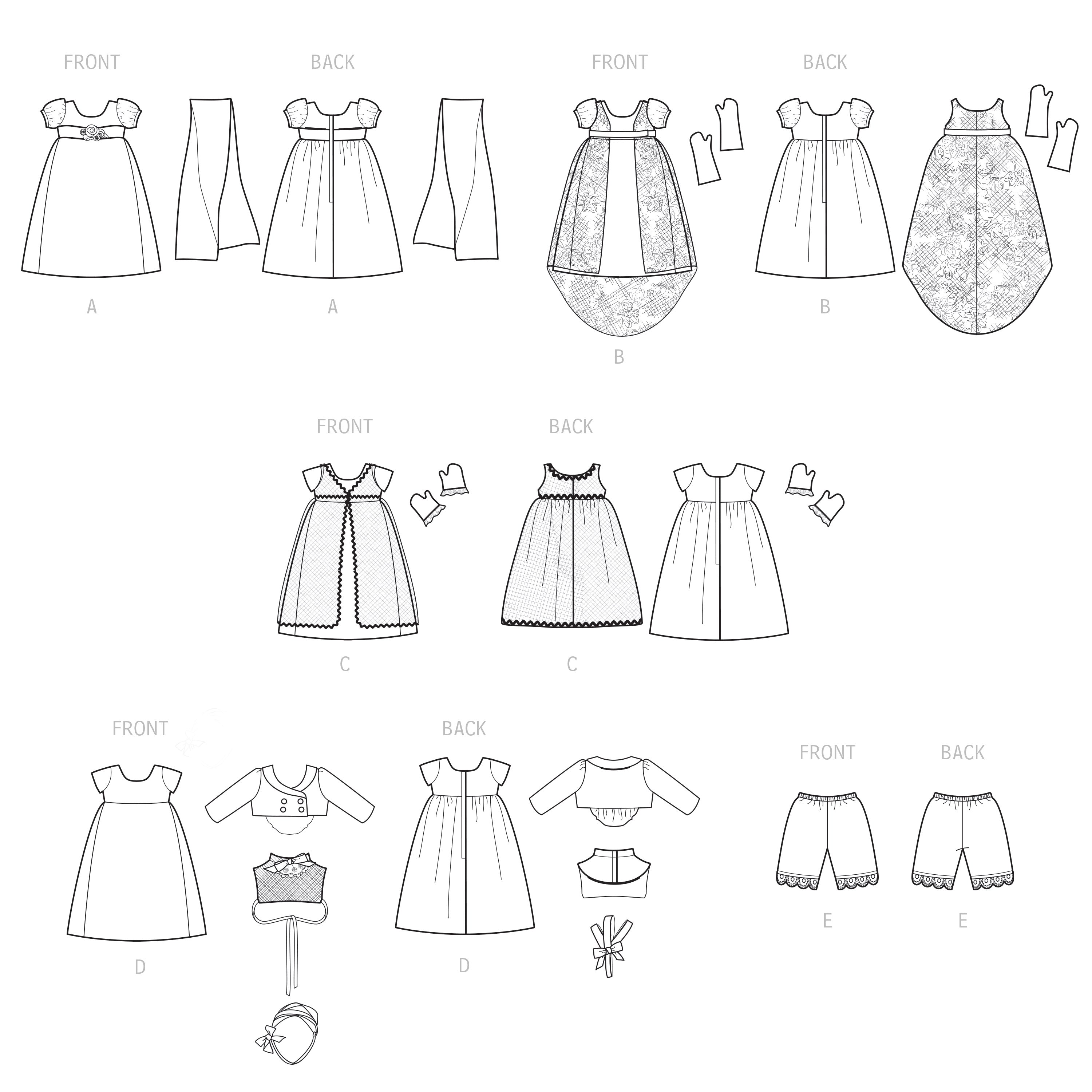 Regency style in miniature - empire waisted gowns have puffed or straight sleeves and can be worn under sheer or lace overdresses to change the look from tea time to court dress. Add a cropped jacket and sheer dickey for a proper day look. All gowns close with hook and loop tape for easy dressing. Shawl, knit gloves and hair accessories included. Pantalets with lace trim have elasticized waist.