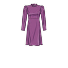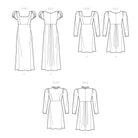 A-line empire dress in two lengths has low shaped neckline or high ruffled neck. Tulip shaped, short puff and long puffed sleeve options included.