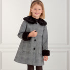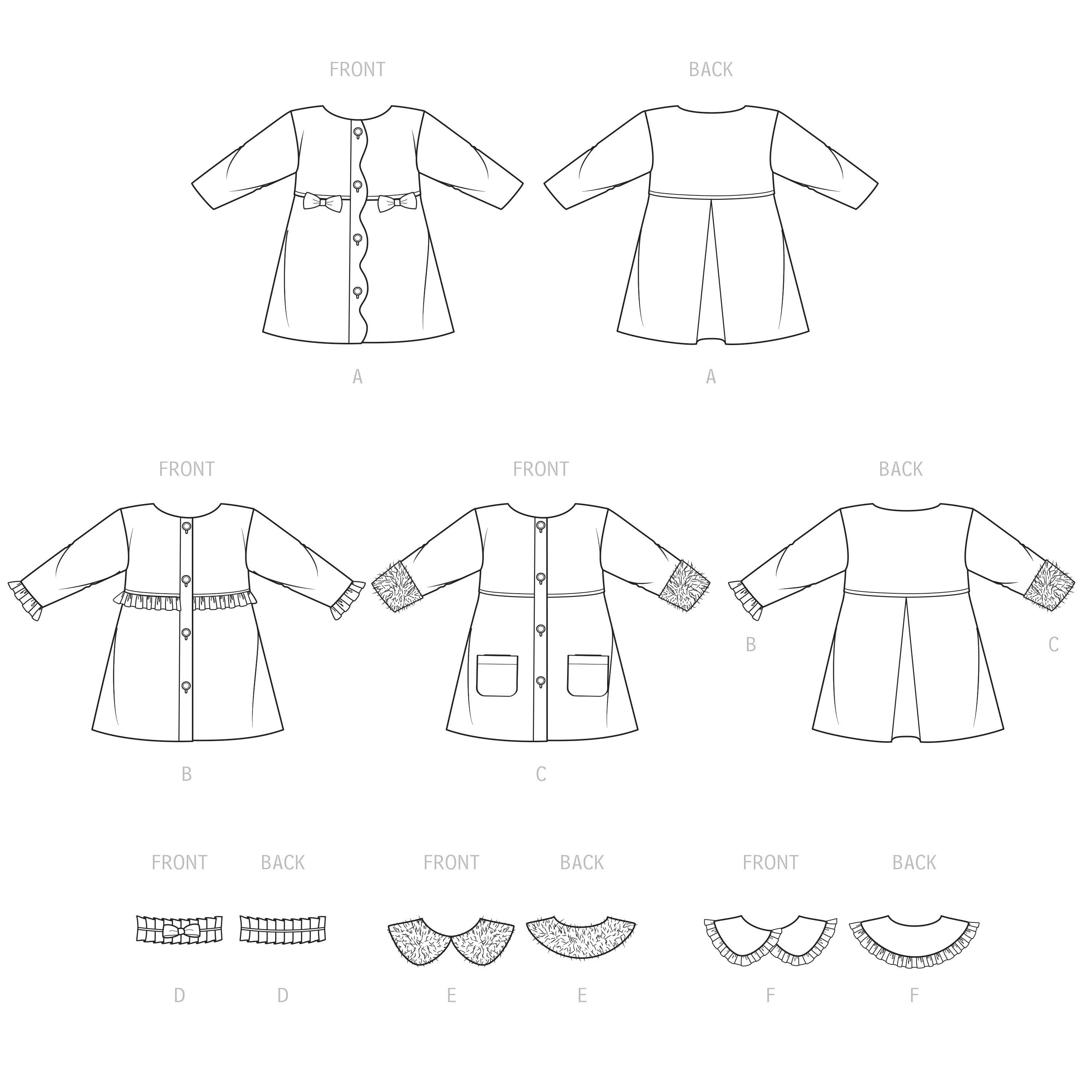 Lined coat with option for shaped front button placket. Pocket, bow and self-ruffle details. Back yoke with pleat. Detachable collar options for ruffled peterpan collar, fur collar and pleated collar with contrast ribbon and bow attached at coat neckline with hidden buttons.
