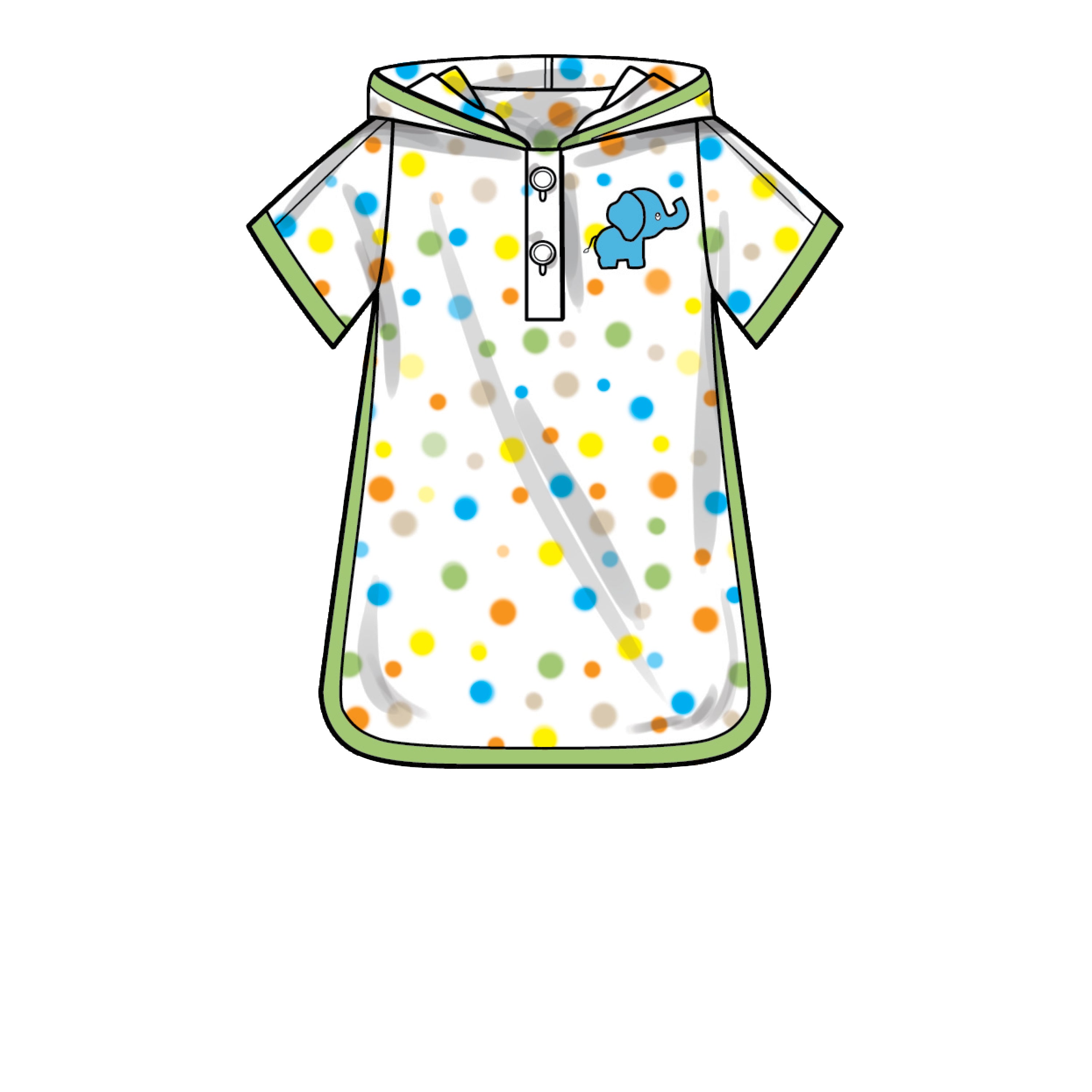 Unisex bath set has a hooded robe with bias tape trim, stitched down front ties and back elastic casing. Pull-over button front hoodie is trimmed with bias tape with optional trim and applique. Hooded towel wrap and hand wash glove are finished with bias tape and have purchased appliques.