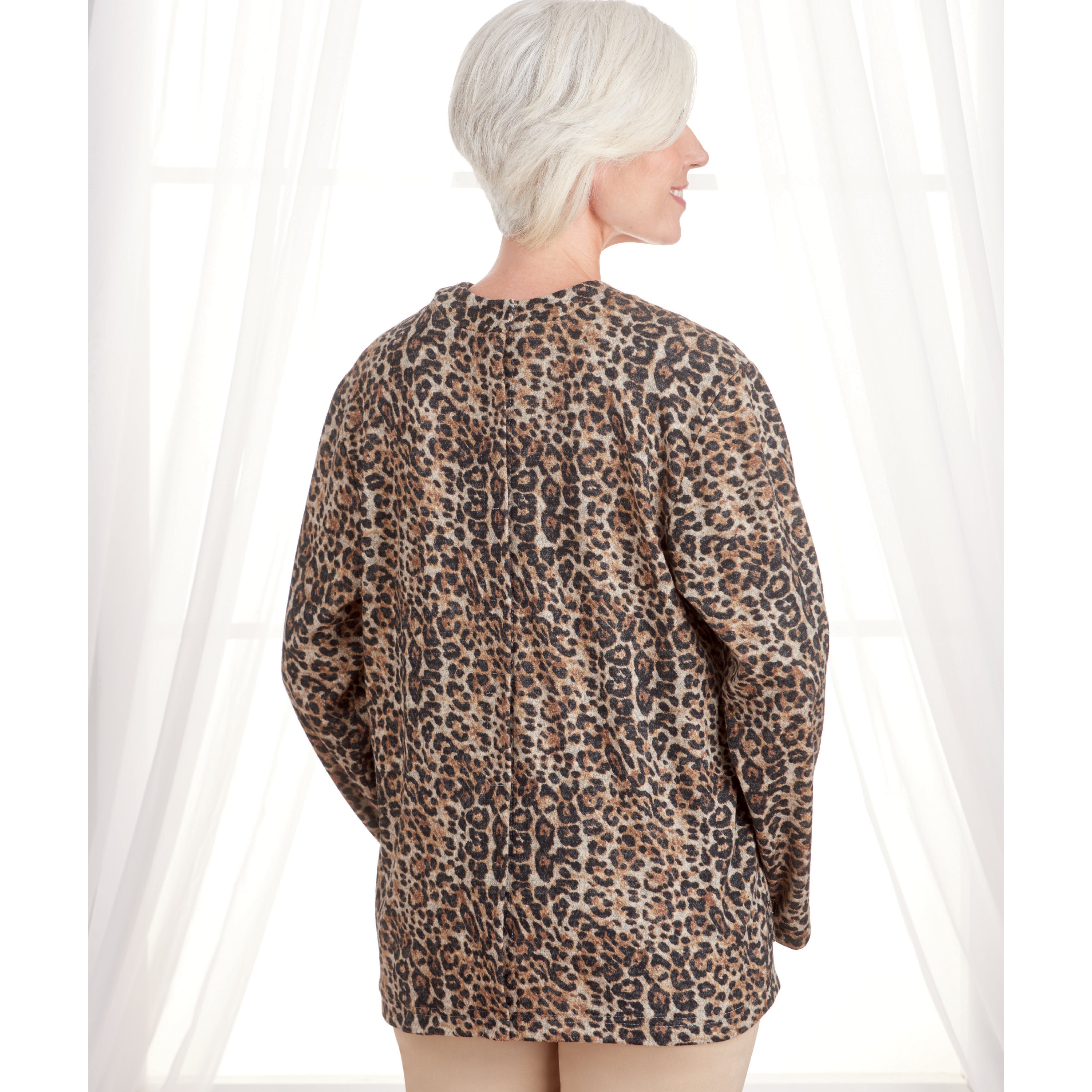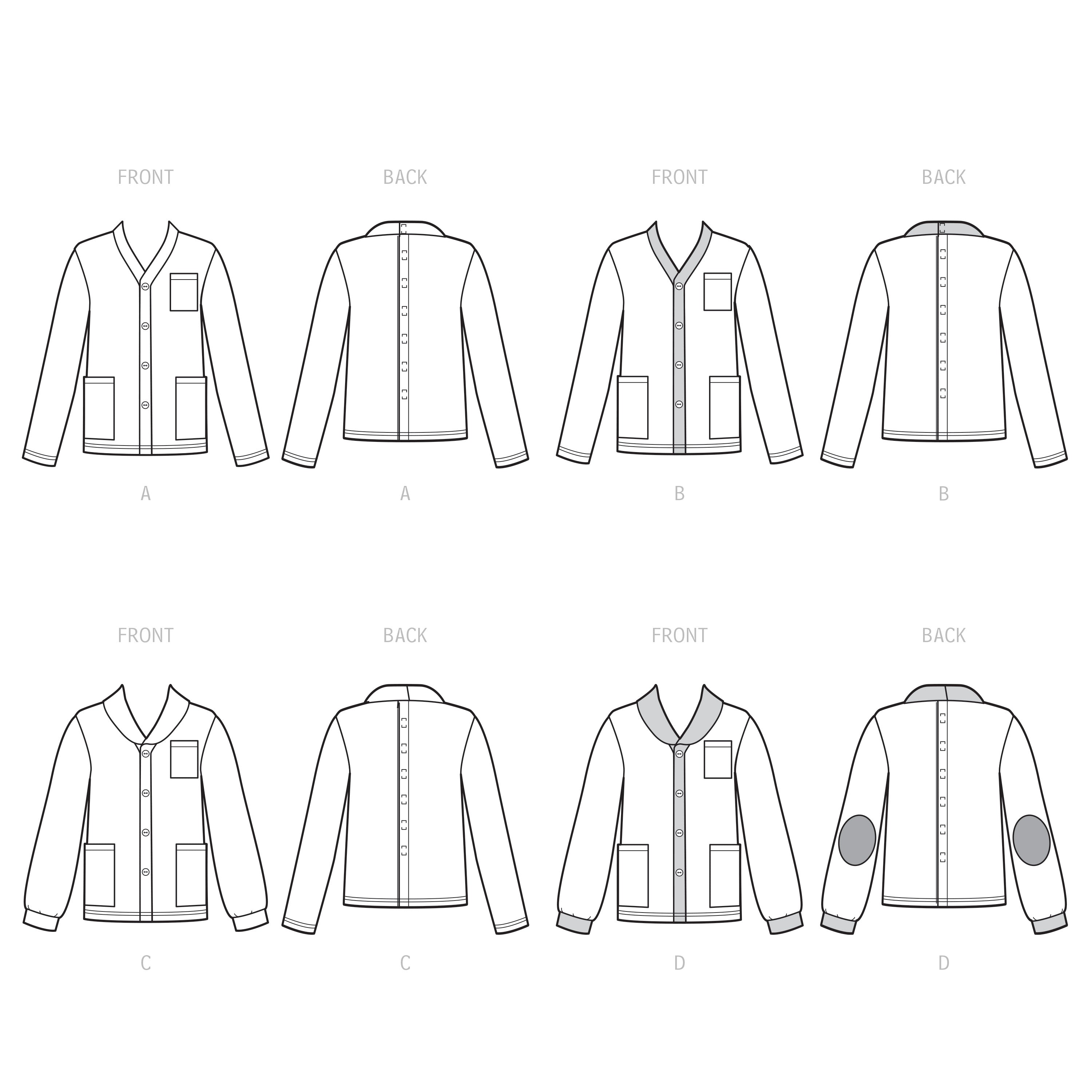 Cardigan has traditional V-neck front, buttons are for appearance only. Faux overlap on all views can be in either direction. Full back opening closures are hook and loop fastener tape for easy on and easy off dressing. Get creative with options for sleeves and cuffs, pockets, shawl collar and bands. Add elbow patches for a classic look.
