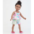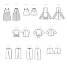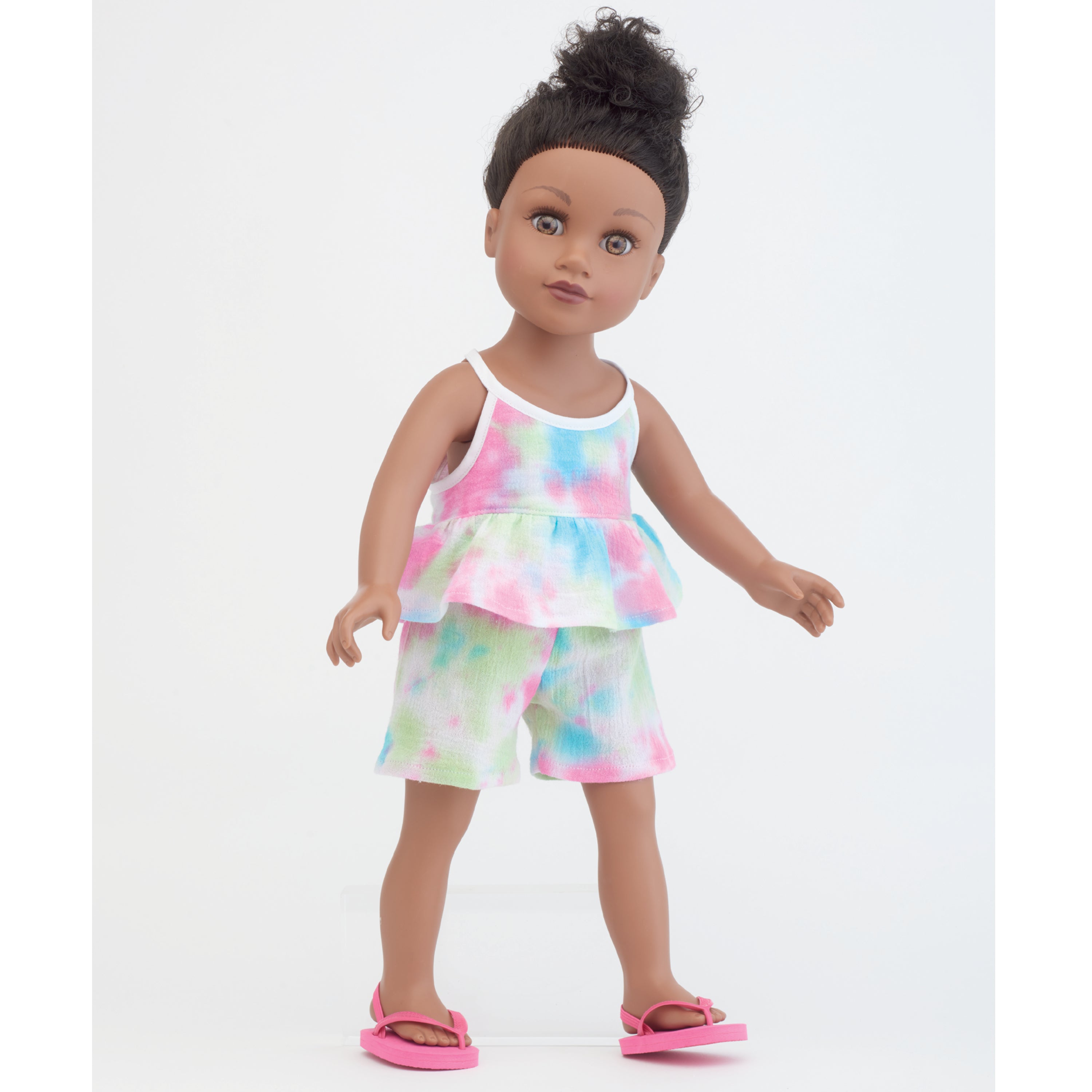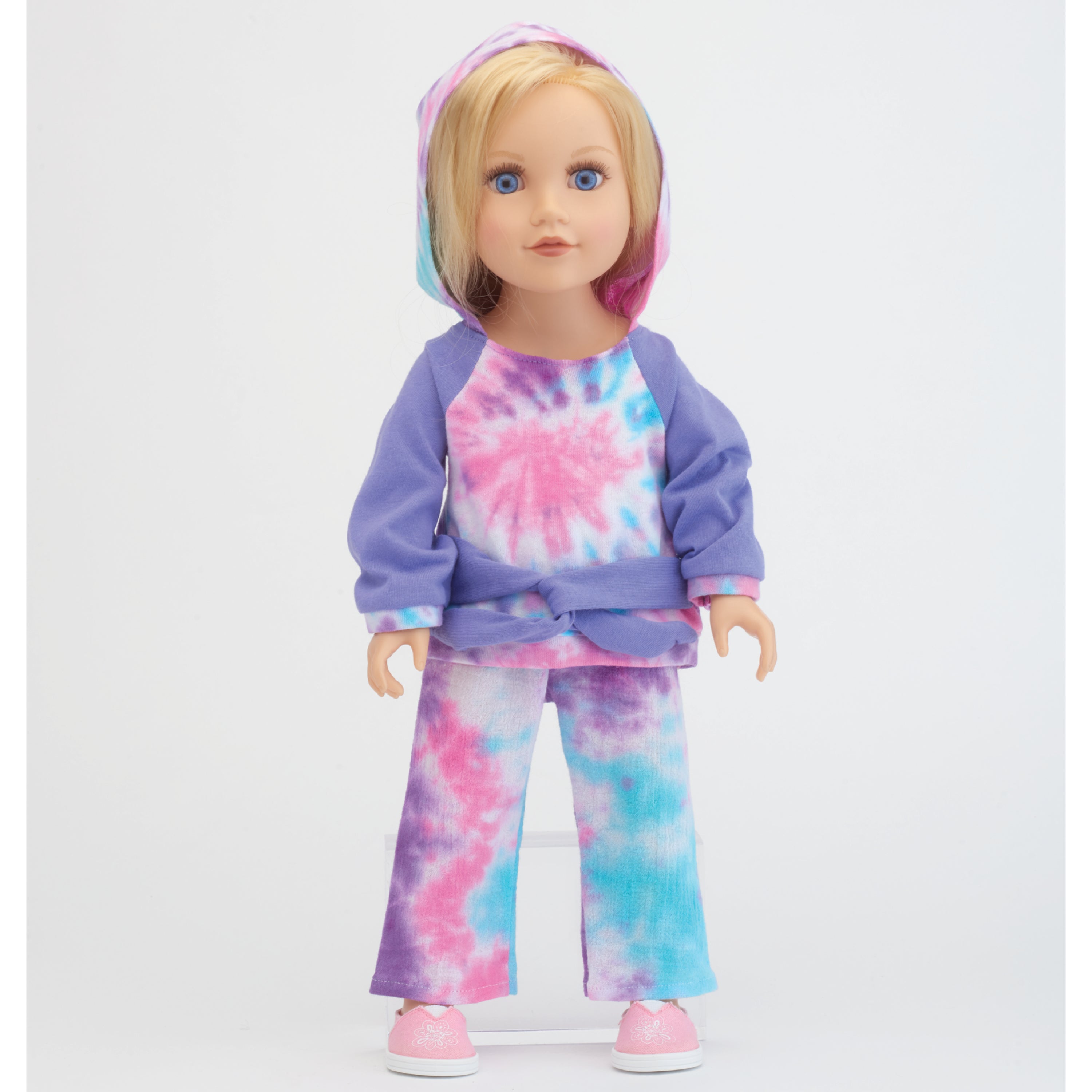 Dress and fluttery tank have hook and loop tape closure and contrast bias tape binding and shoulder straps. Knit hoodie, tee and top have twist and tie details at the waist and back hook and loop tape closures. Jeans have stitching details, back opening and front faux button. Pull on pants and shorts have elastic waist. Give these mix and match pieces a fun twist by tie dyeing the fabric beforehand!