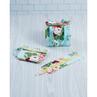 Use a mix of pretty prints for tea time accessories. Mug case with pockets for tea bags and sweetener is 5" H (13cm) x 5.75" W (14.6cm). Tea cup design tea bag case is 5" H (13cm) x 6" W (15cm). Mug cozy is 3" H (7.5cm) x 11" W (28cm).