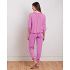 Pull-over tops have round neckband, three-quarter or short sleeves, softly pleated bodice, 1" elastic at hem and hidden nursing panel. Pull-on ankle length jogger and shorts have elastic and drawstring waistband.