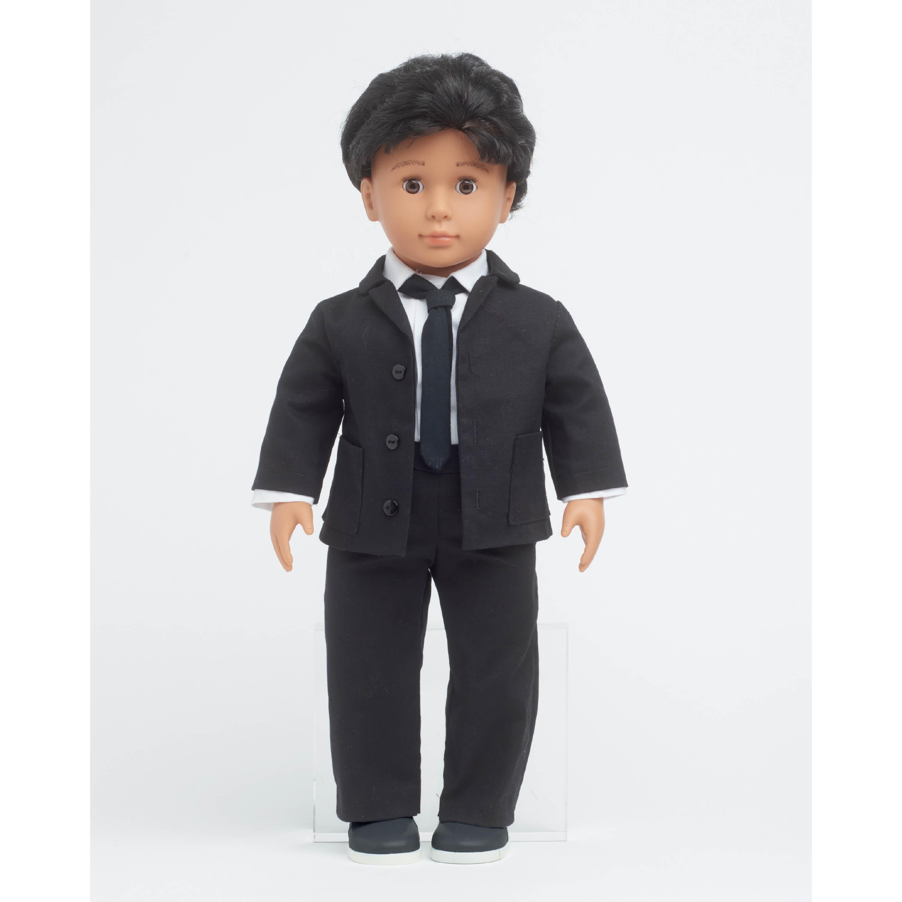 Totally rad 80's wardrobe for 18" dolls includes suit with skinny tie, knit t-shirt, button front shirt with long or short cuffed sleeves, overalls with contrast belt and matching scrunchie, and prom-worthy party dress with ruffled straps and bow accent. See envelope for more information.
