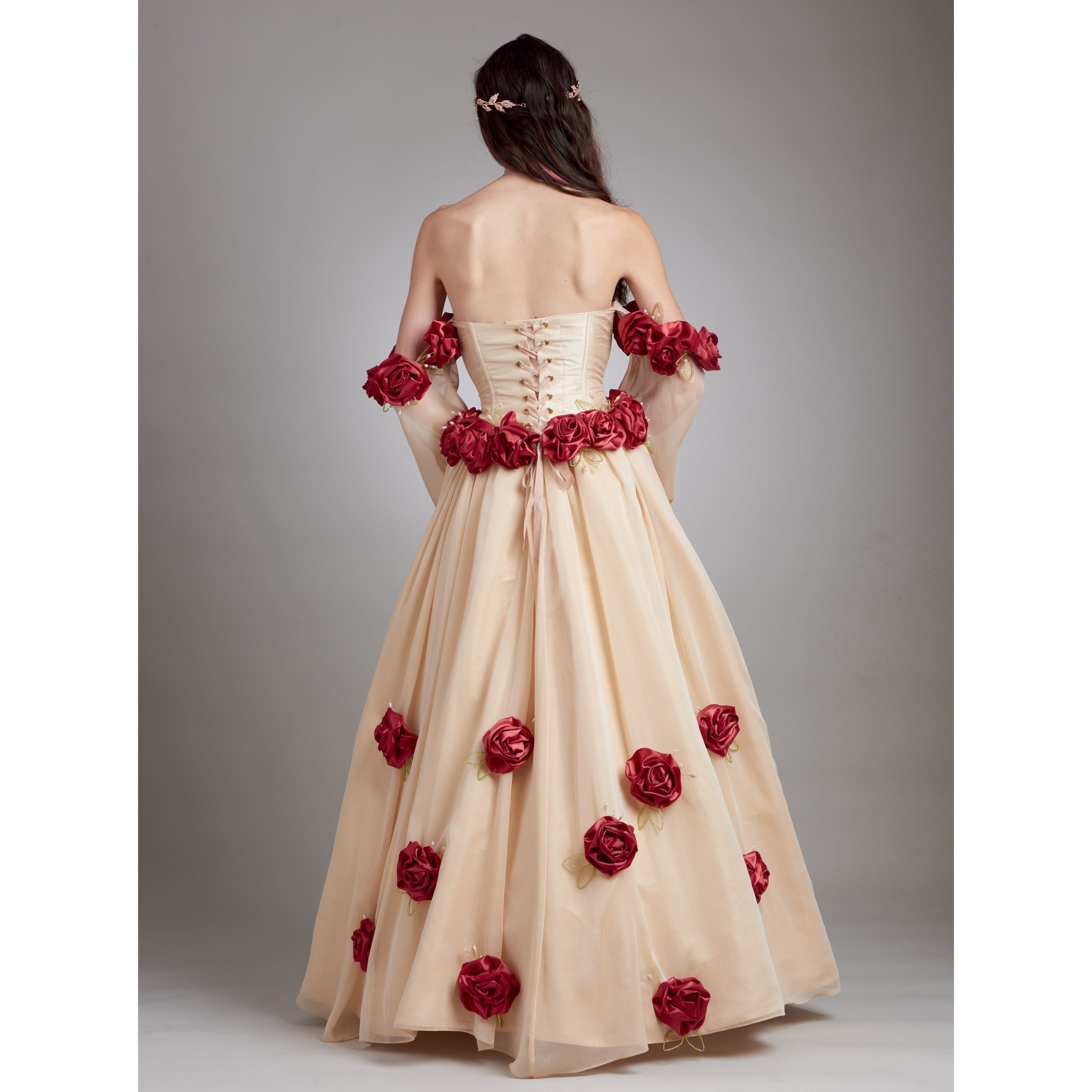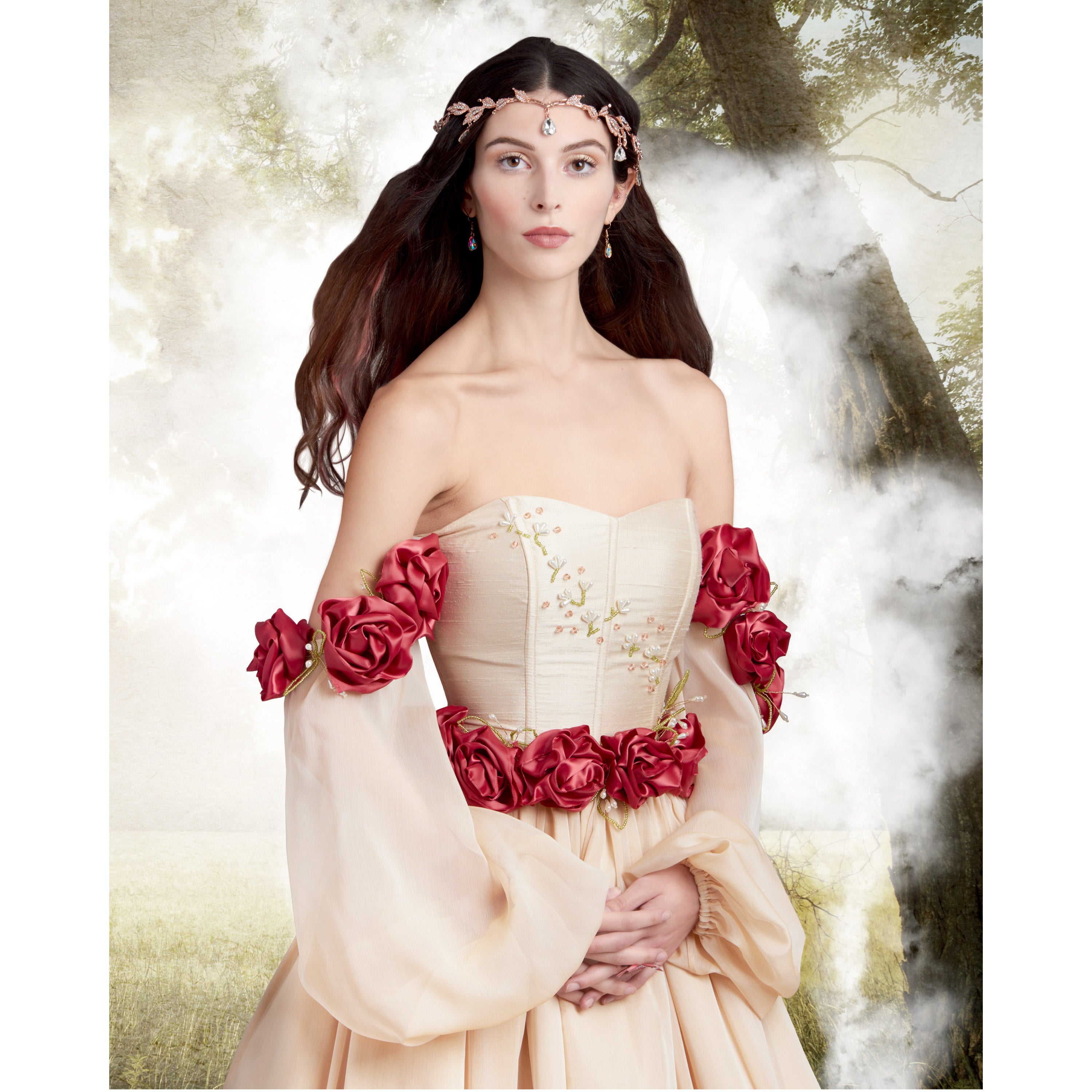 Lined boned corset with grommets and back lacing has sweetheart neckline, voluminous off-the-shoulder sleeves with elasticized wrists and optional hand-beading. Floor length skirt has back zipper and gathered overskirt. Costume is embellished with roses crafted from wired ribbon, beaded wire openwork leaves and beaded sprays. Petticoat and headpiece not included. See envelope for more information.