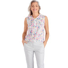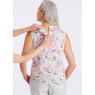 Pretty tops have high-low hem with hook and loop fastener tape at back closure for easy on and easy off dressing. Details include a neck tie collar, a cowl collar and color blocking.
